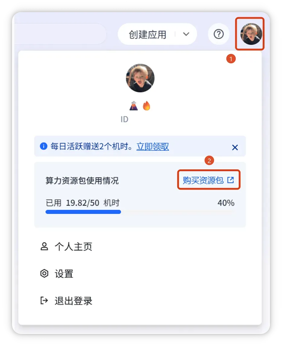 鼠标移动到 CloudStudio 右上角头像后,在展出页中点击【购买资源包】。