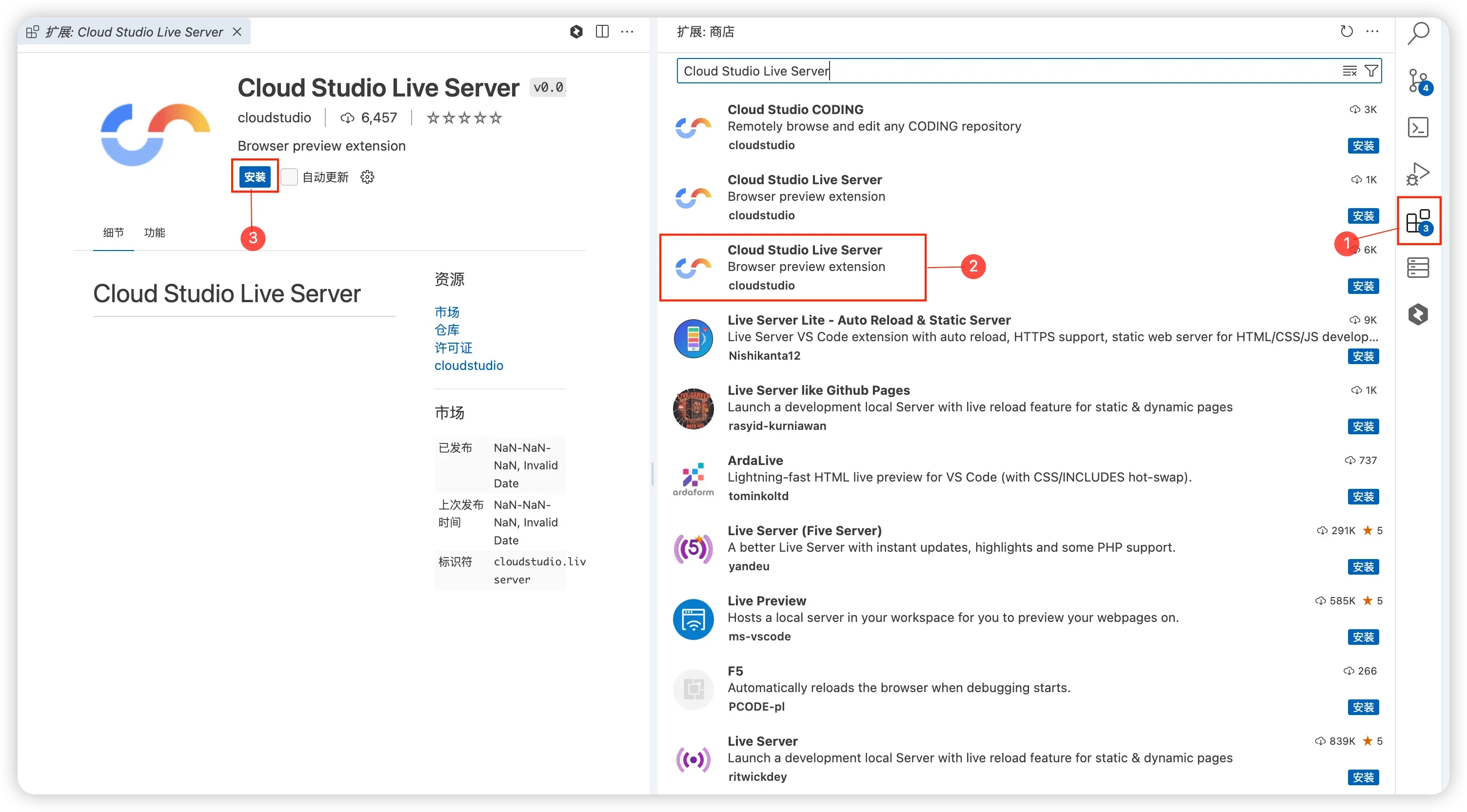 Cloud Studio Live Server。 - 安装完成后,重载窗口(如有提示)。