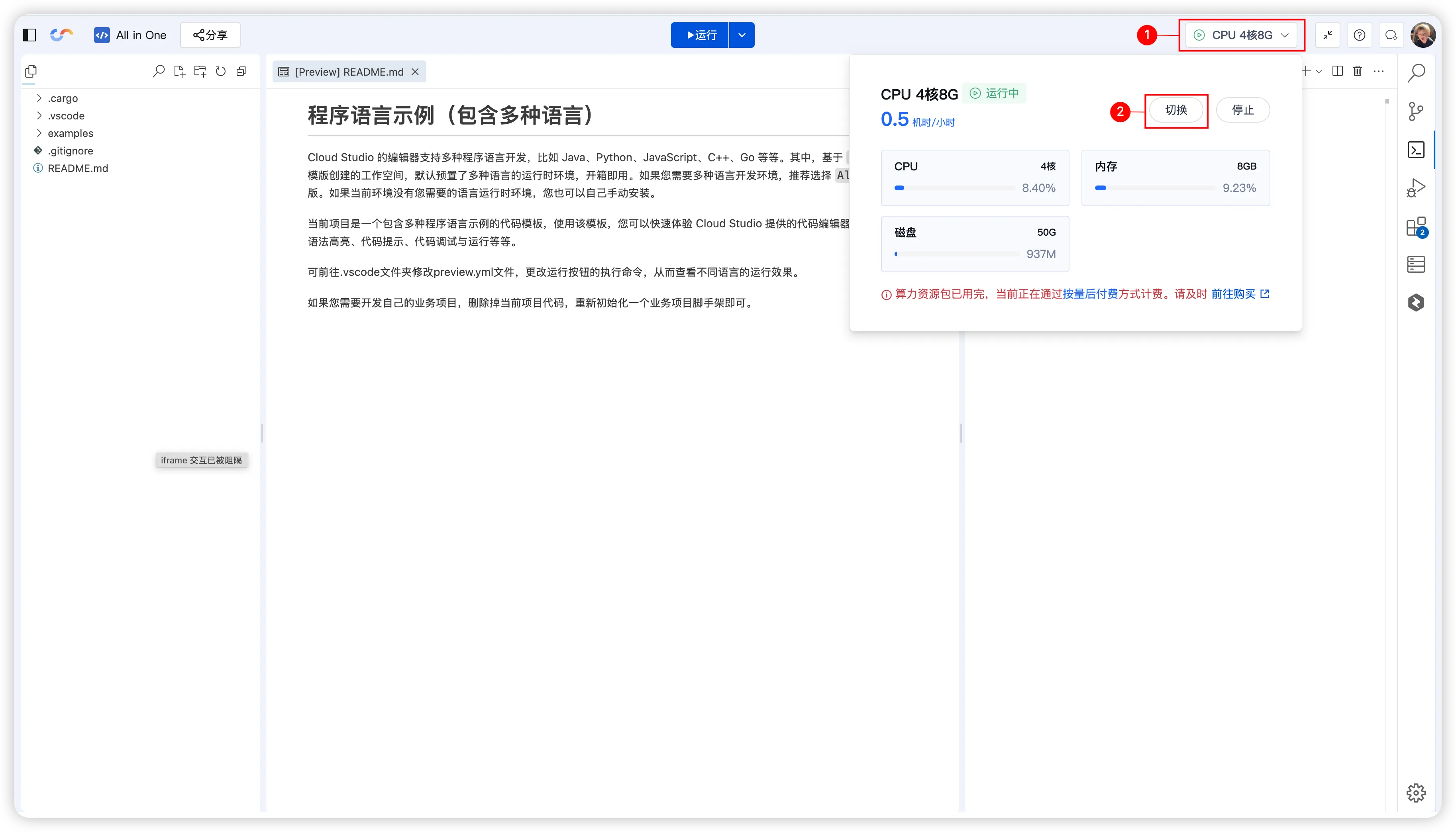 CloudStudio 支持 CPU 与 GPU 算力灵活切换,可根据不同开发/学习场景(如基础编程、深度学习训练)快速调整资源类型,以下为操作指南: