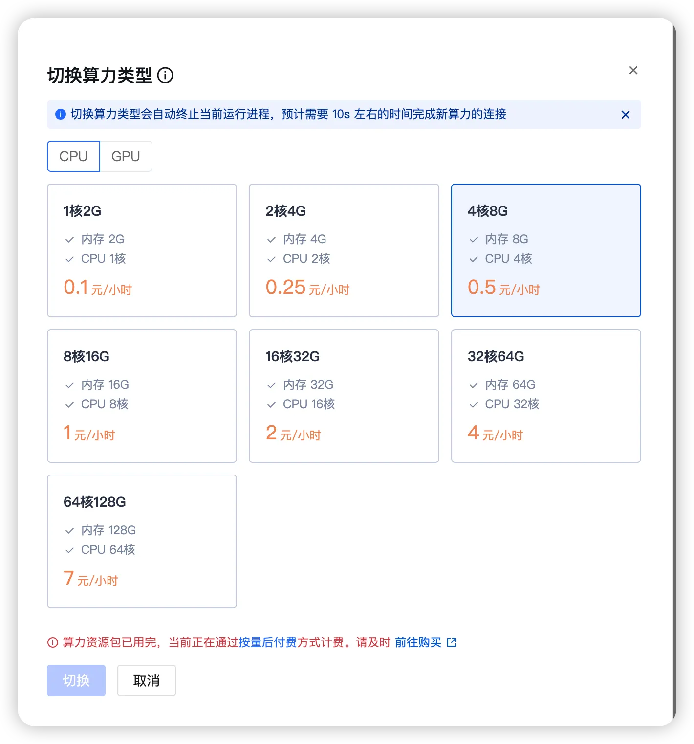 选择算力类型:根据需求选择 CPU 算力(适合普通编程、前端开发)或 GPU 算力(适合大规模数据运算、深度学习训练)。