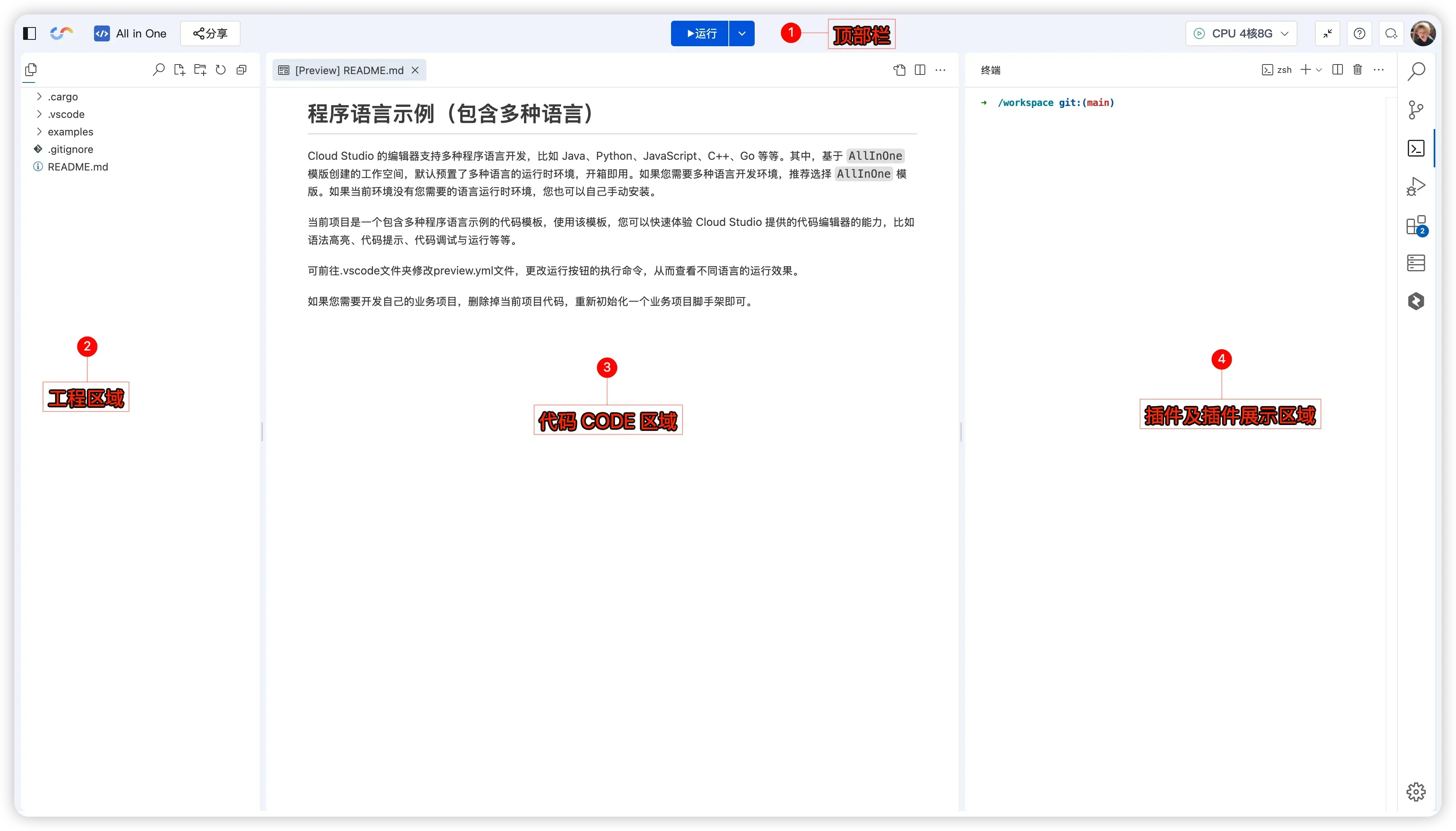 | 插件区域 | 使用 Git、终端、调试、扩展、AI 助手等工具 |