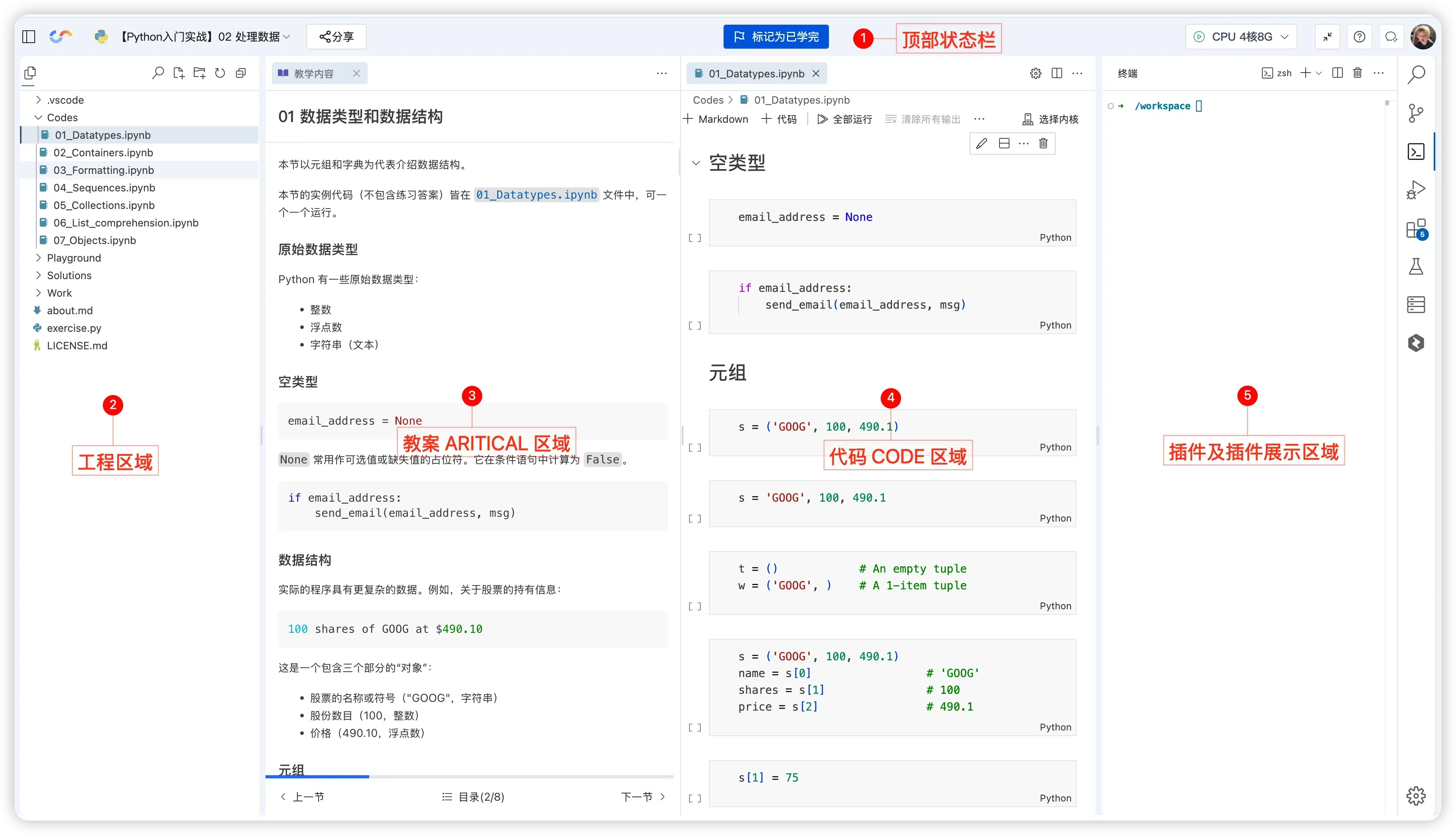 适合跟课程学习,主要包含 5 个区域: