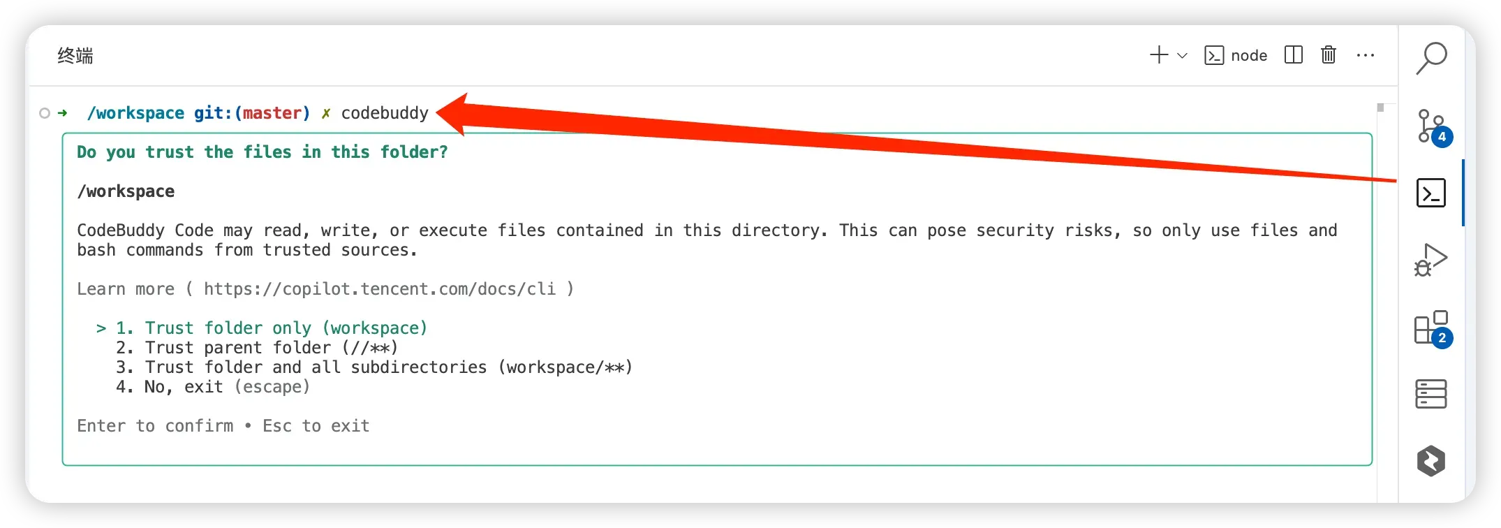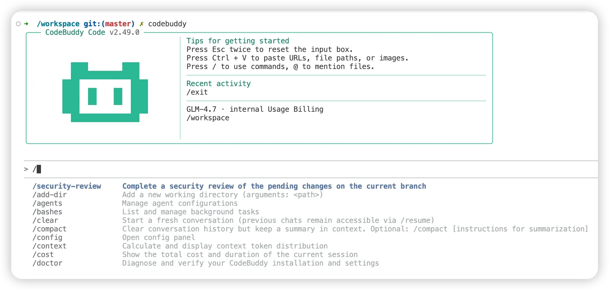 CodeBuddy Code 是 CloudStudio 内置的智能编码工具,可在终端中通过自然语言完成常见开发任务(解释/优化/修复代码、生成测试、代码审查等)。