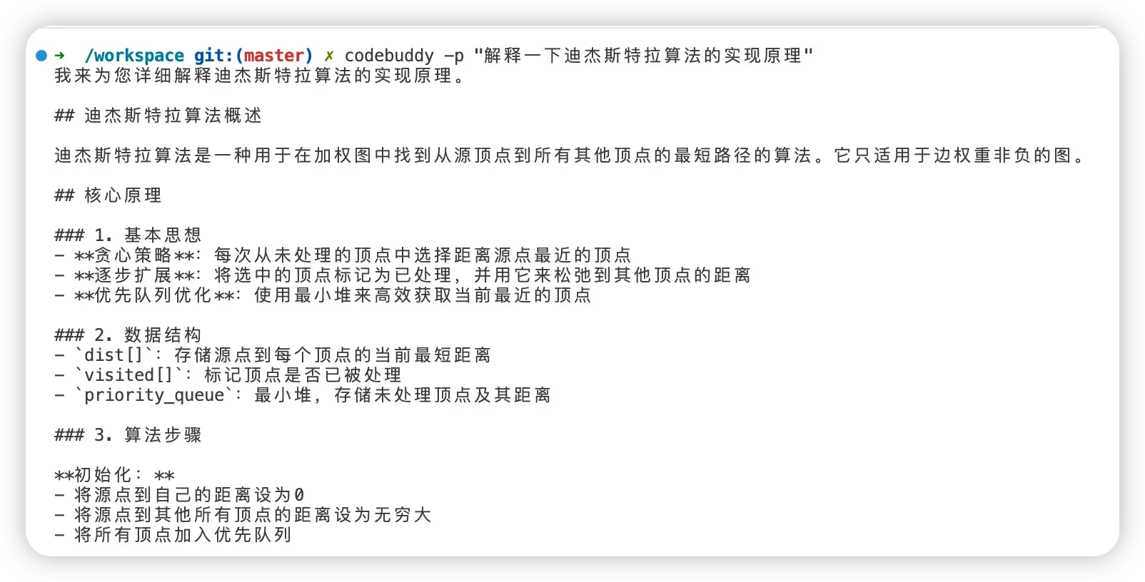 codebuddy "..." | 执行单次任务 | codebuddy "解释这个函数" |
