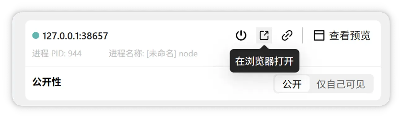 在浏览器中打开:点击 「在浏览器打开」 按钮,本地默认浏览器自动打开端口预览页面,支持结合开发者工具调试。