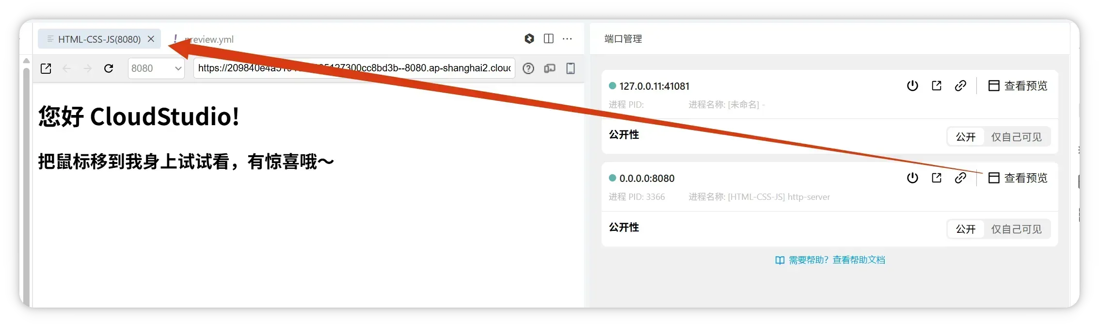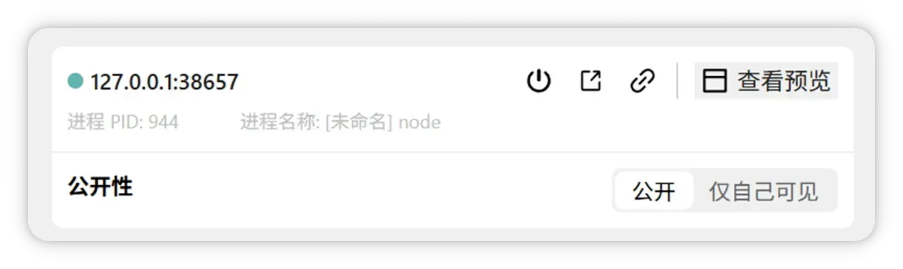 在端口卡片中点击 「查看预览」,会自动打开 Web 预览窗口并加载该端口页面。