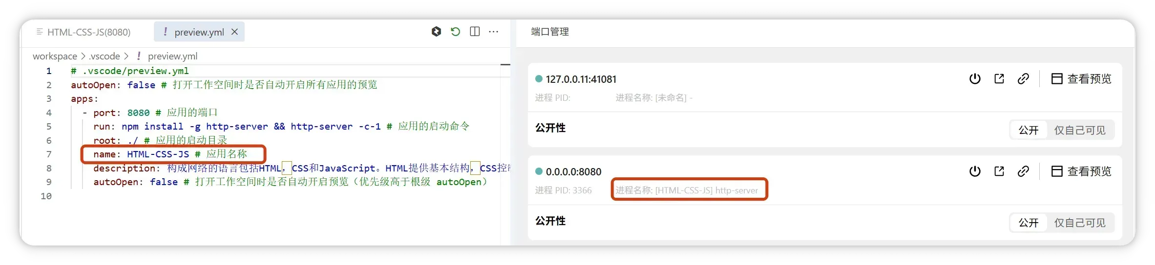 preview.yml):显示为[preview.yml 的 name] 进程名称。