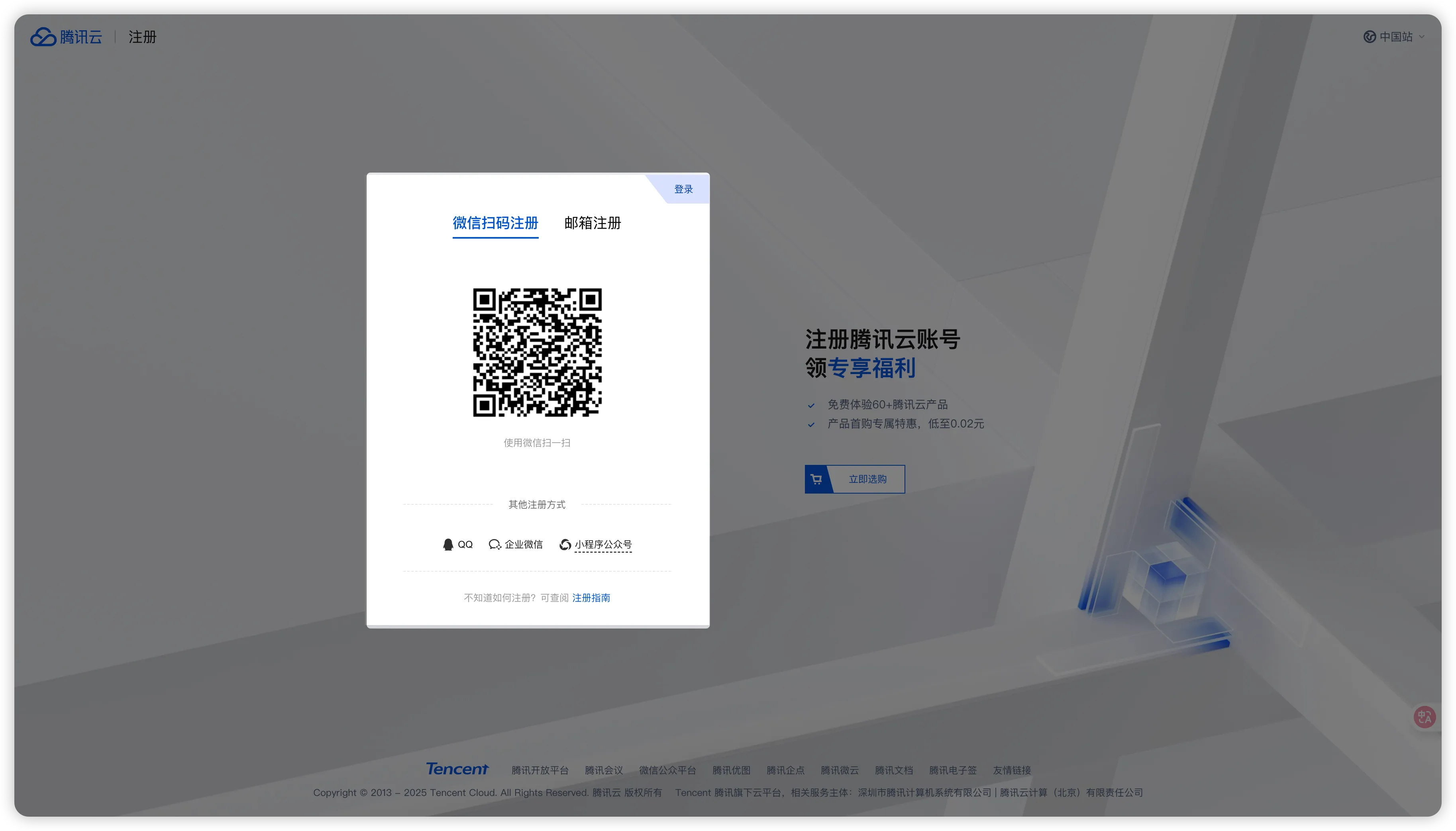 访问腾讯云注册官网,点击右上角"免费注册"按钮。