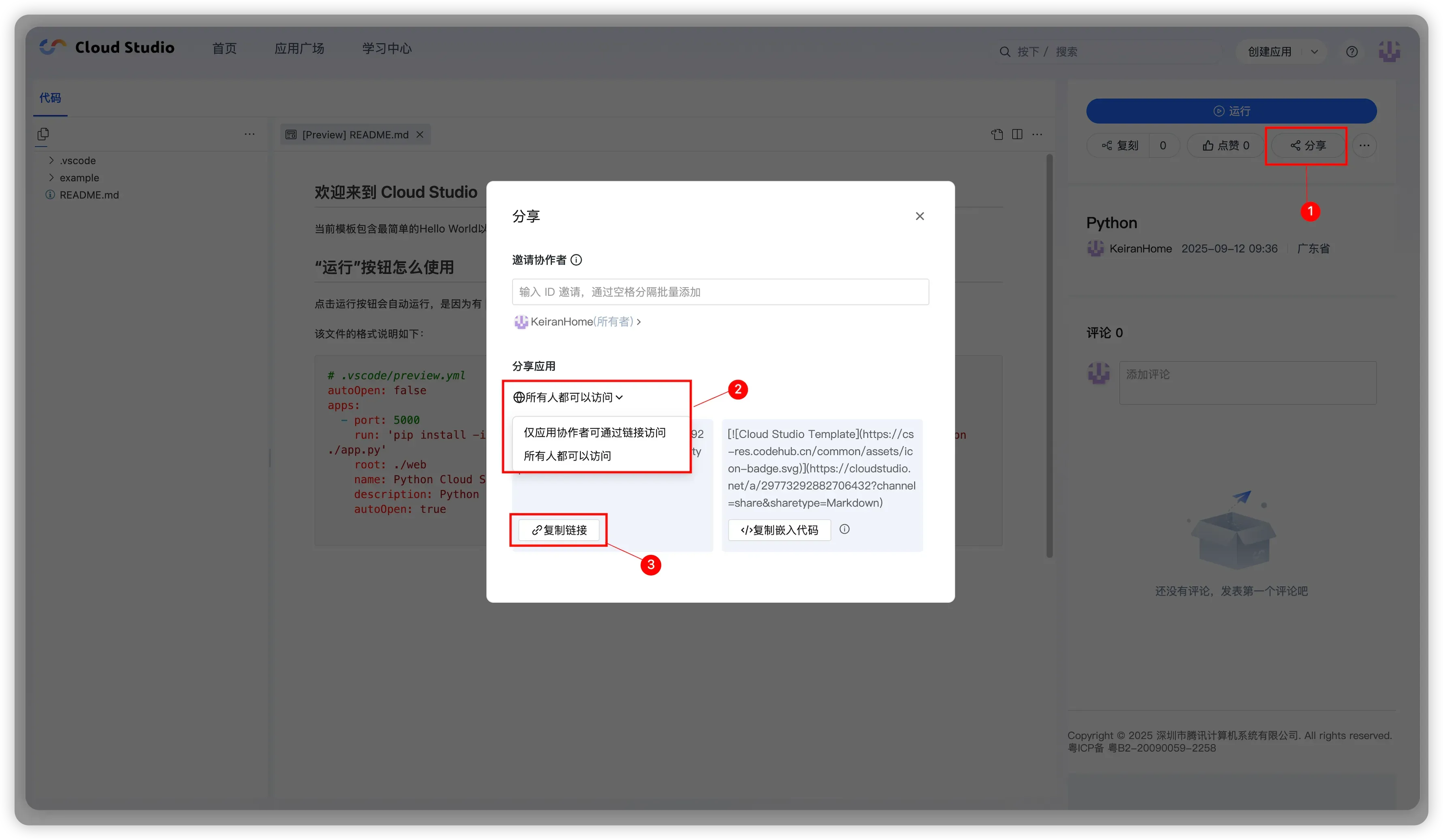 可设置分享链接的访问权限:选择 「仅应用协作者可通过链接访问」 或 「所有人都可以访问」。设置完成后,点击 「复制链接」,即可将链接分享至所需渠道。