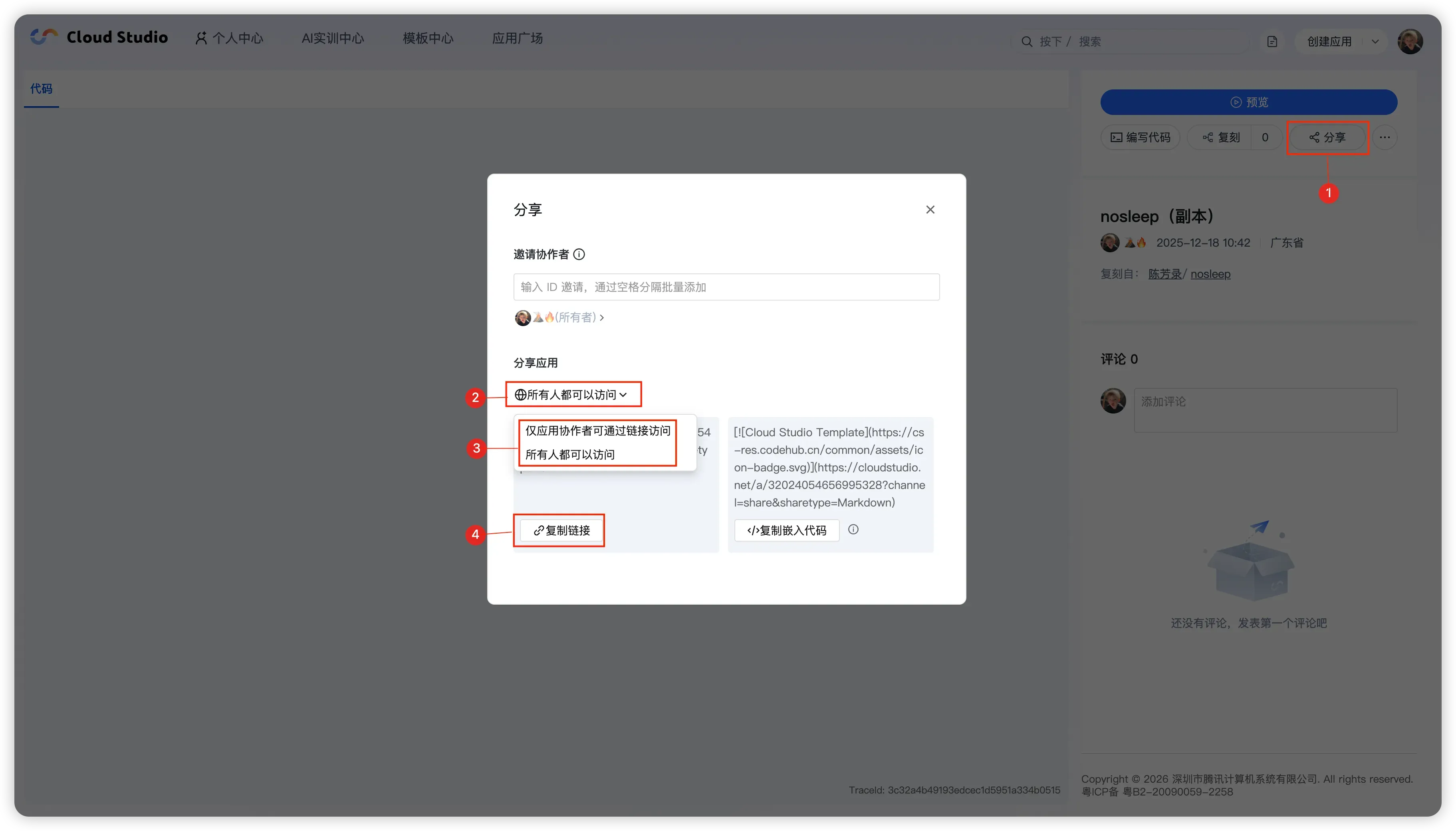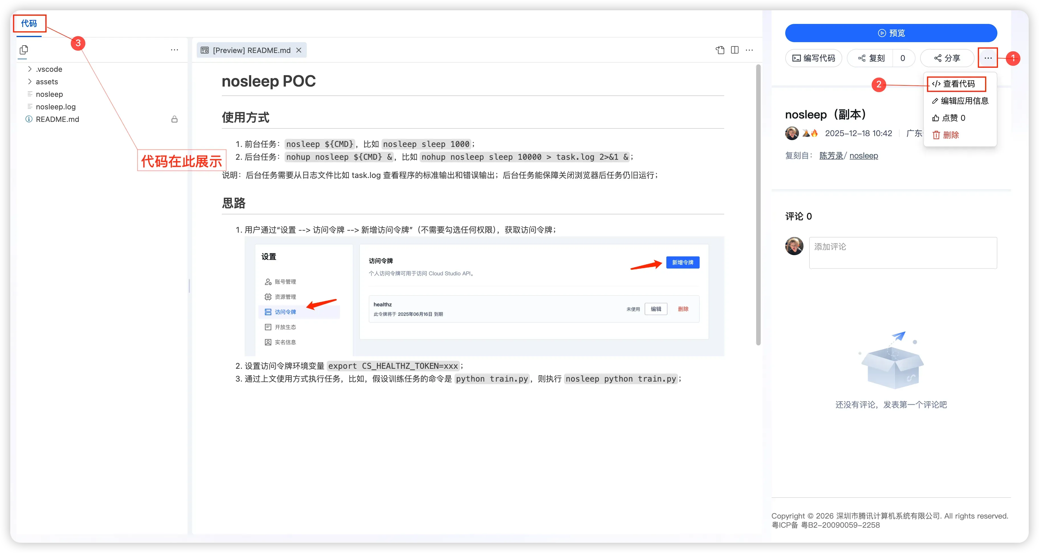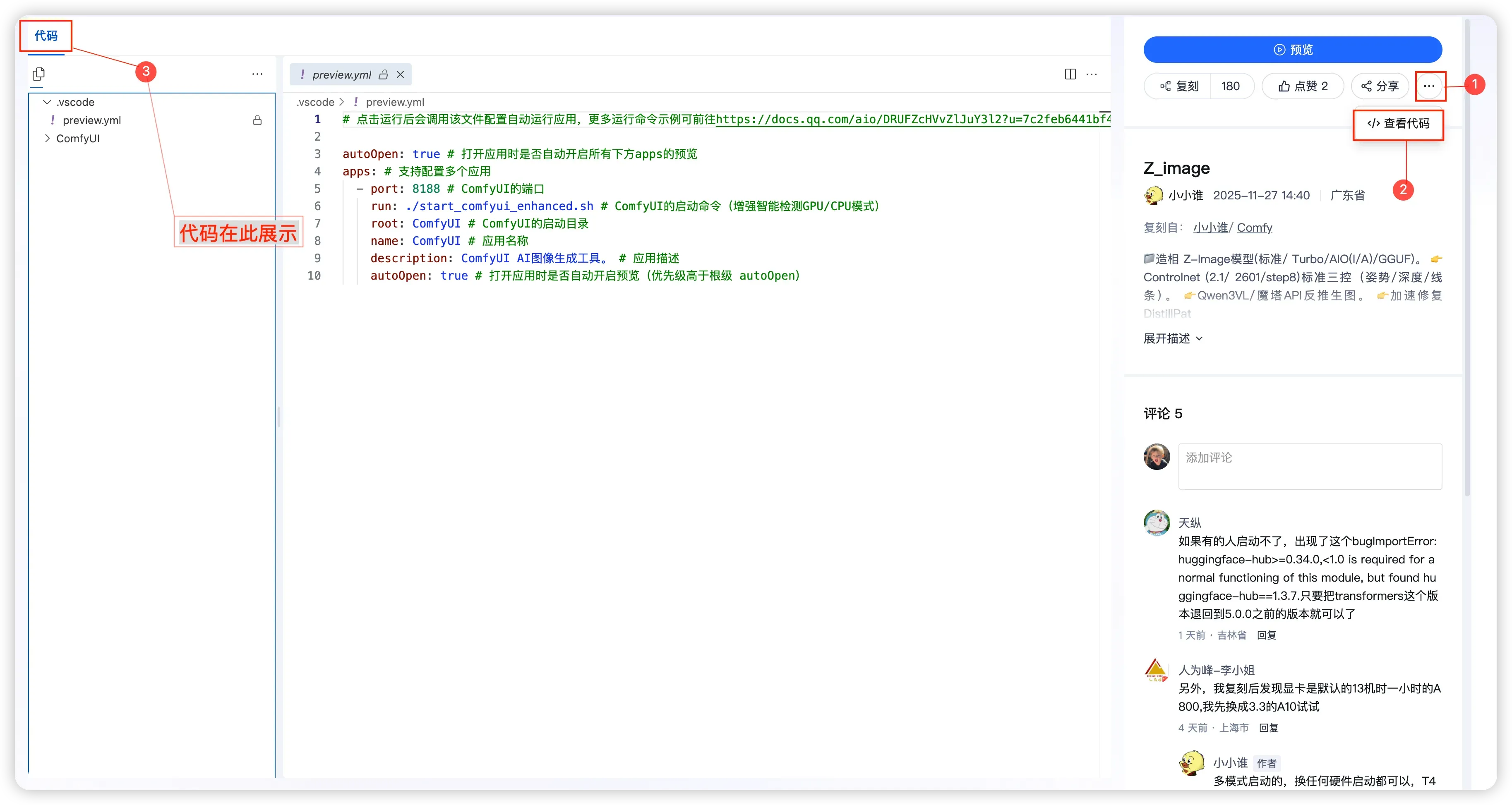 他人的应用:以运行体验、查看代码、复刻、点赞/评论、基础分享为主