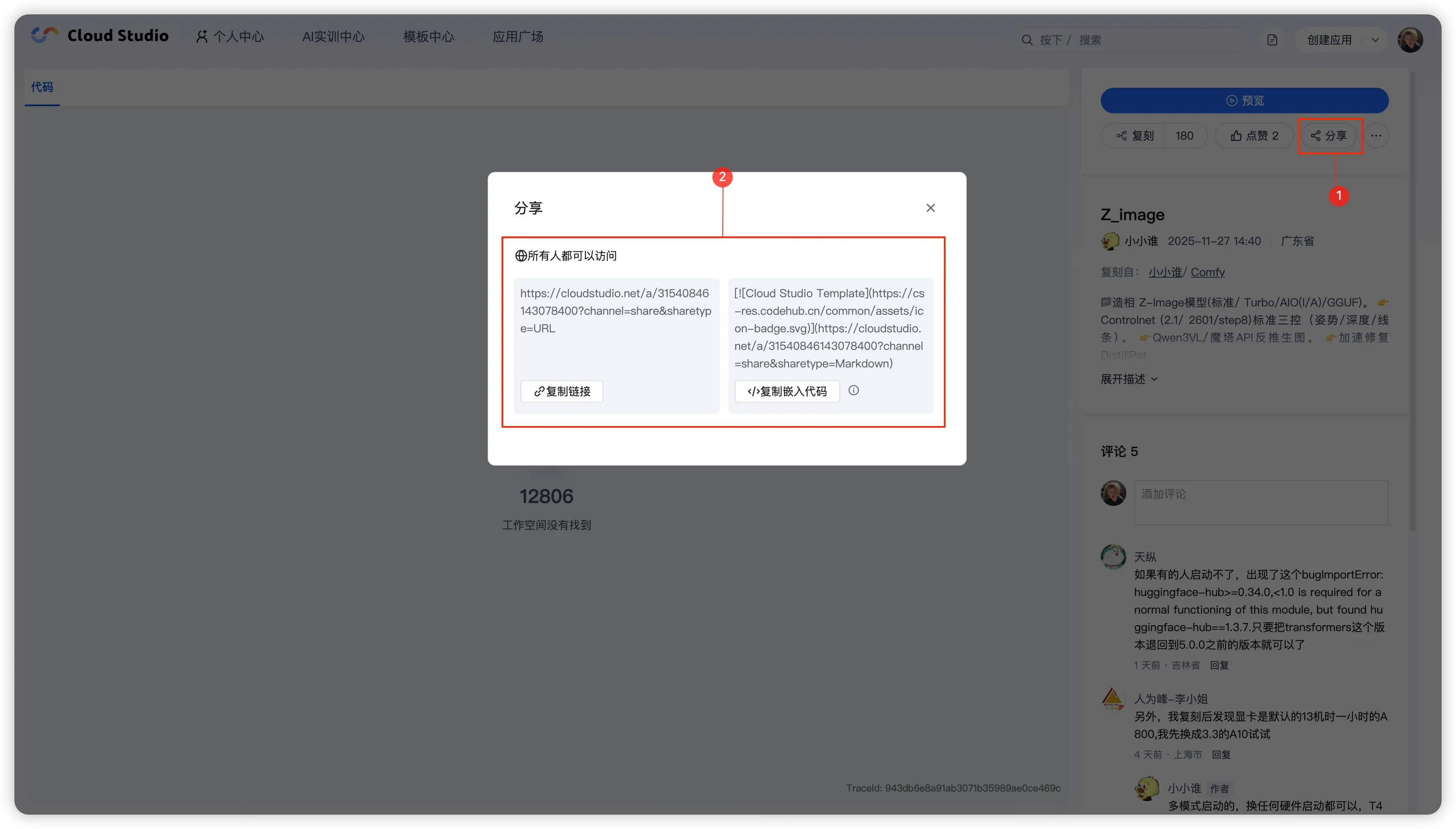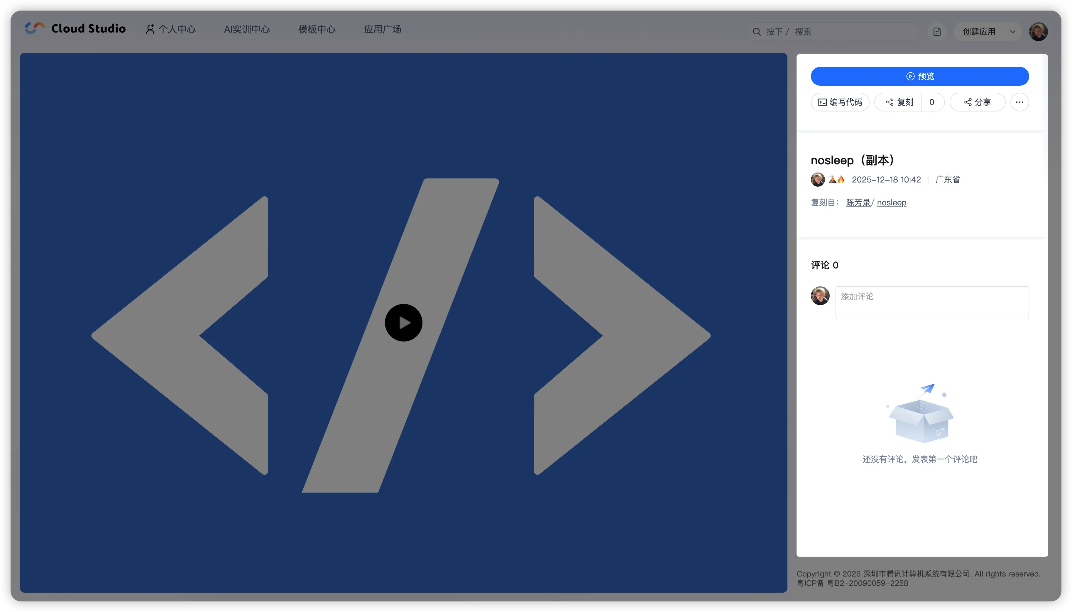 应用主页用于展示单个应用的详细信息与操作入口。你可以在这里快速 运行体验、查看代码、复刻二次开发,并根据权限进行 分享/协作/管理。