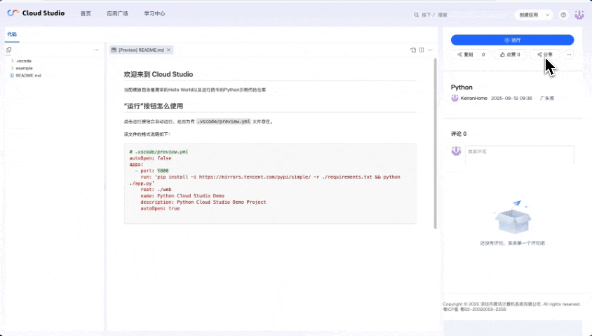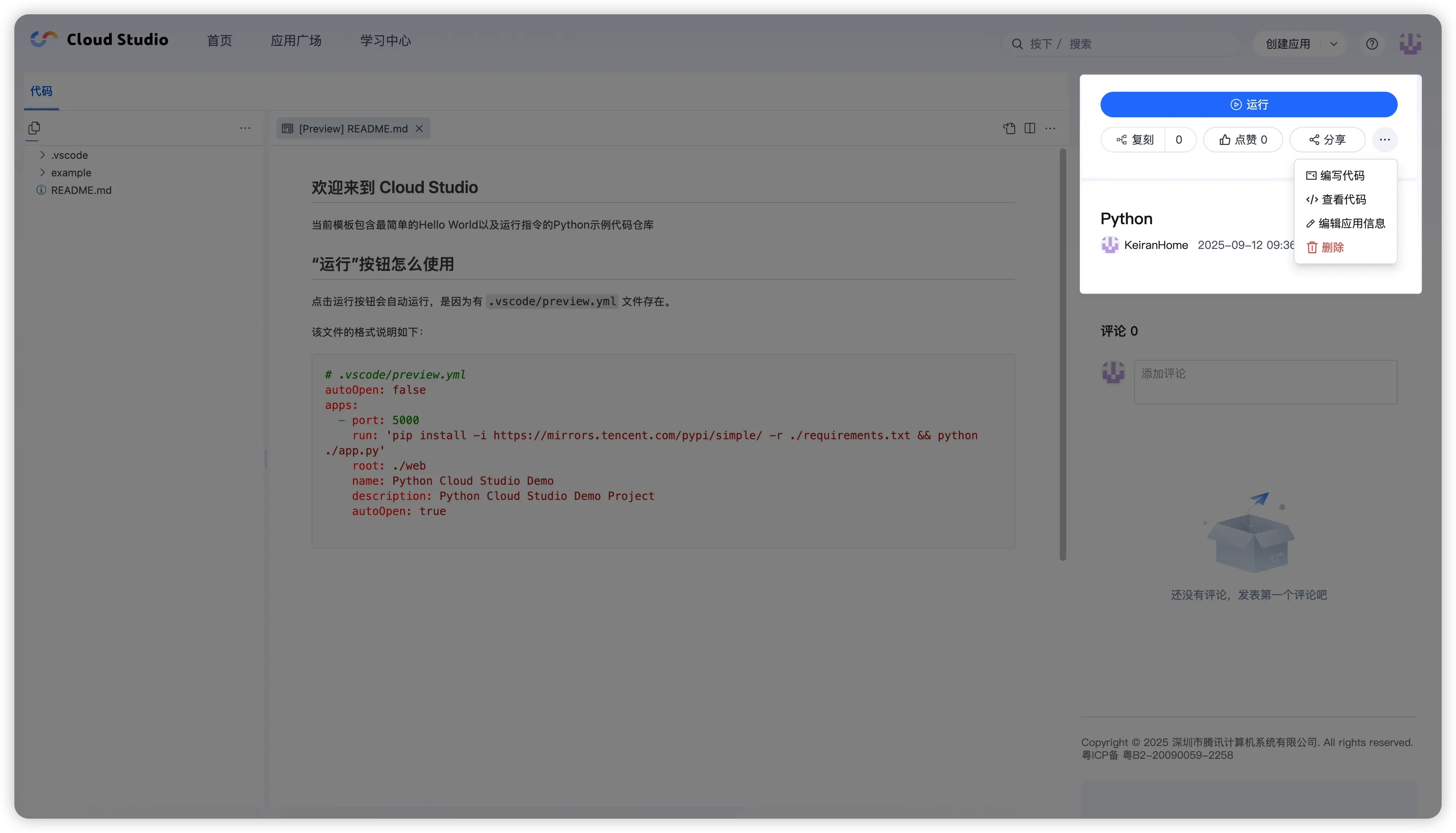 直接启动应用,主要用于预览应用的实际运行效果,无法对应用代码进行修改。若需调整应用功能,需通过后续的 「复刻」 功能操作。