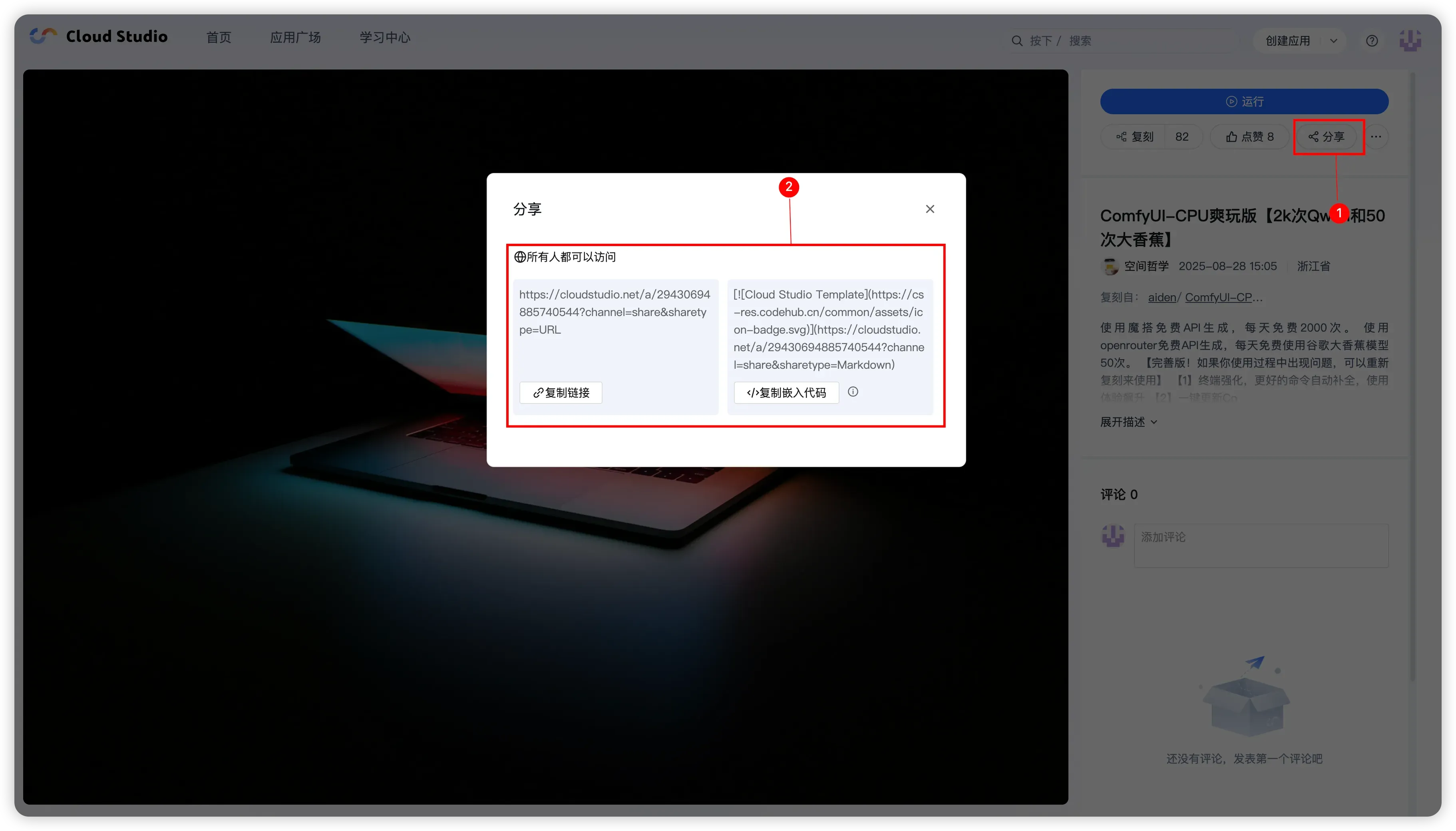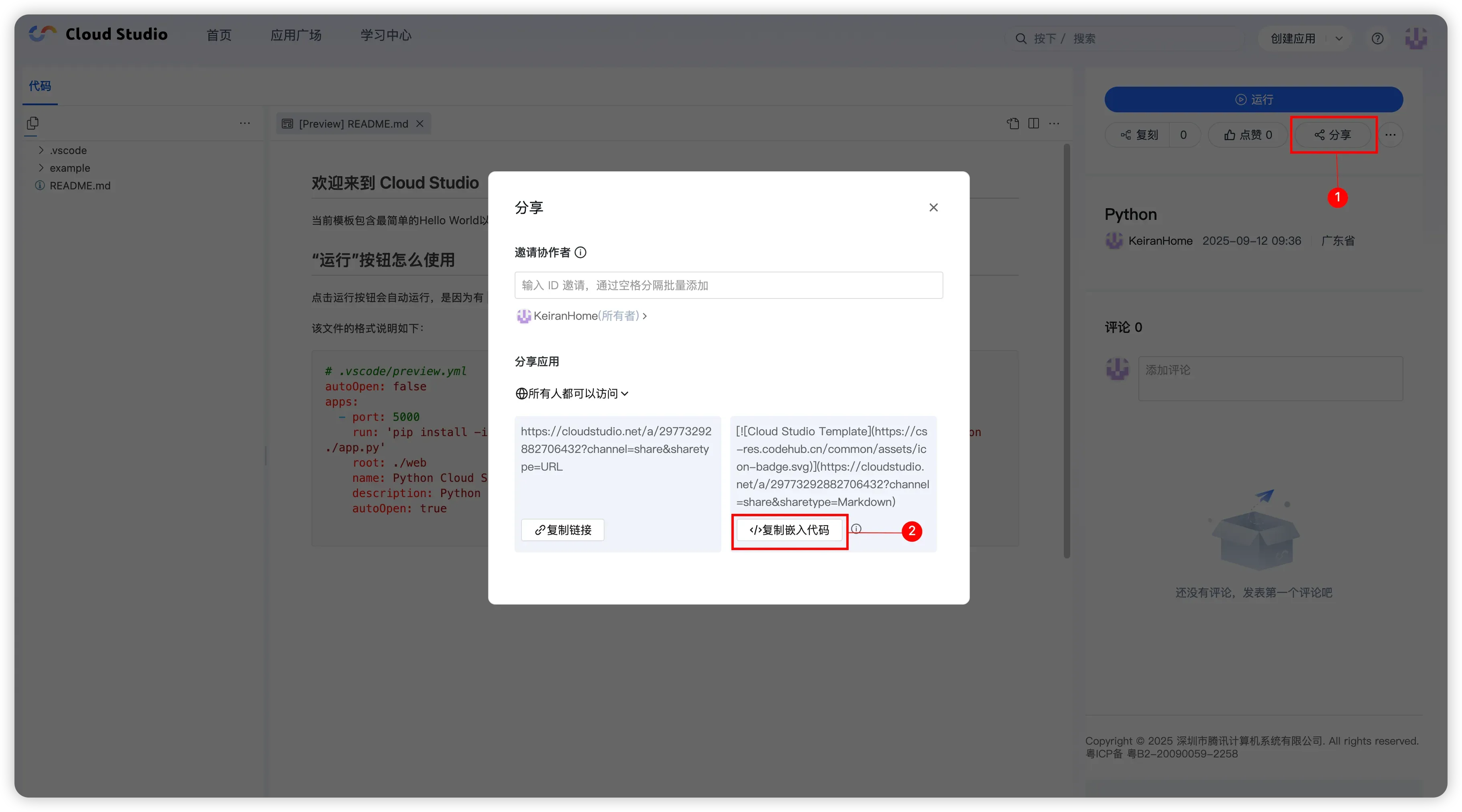 点击 「复制嵌入代码」 按钮,可将应用的嵌入代码复制到剪贴板,随后可将其嵌入至 README、博客等场景中,方便他人通过嵌入内容获取该应用。