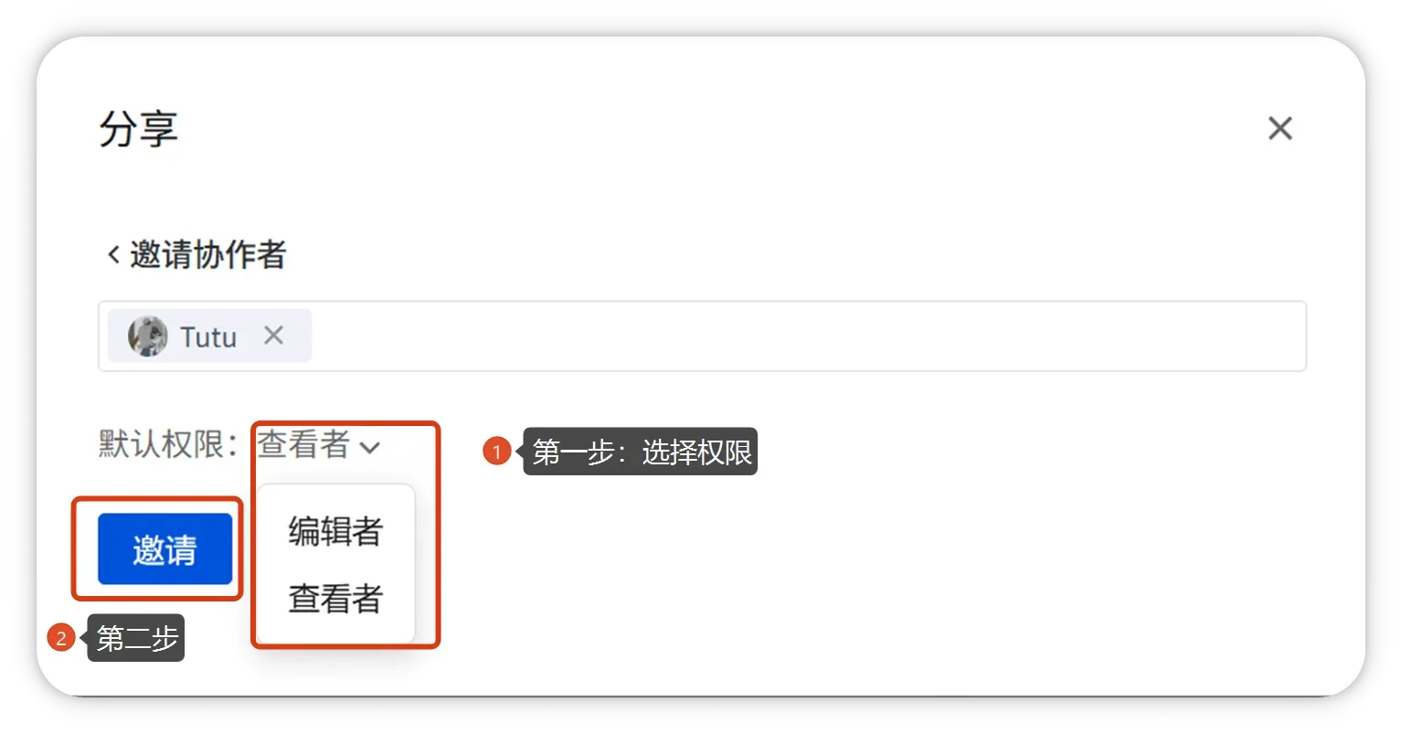 编辑:分享页修改成员权限(查看者 ↔ 编辑者)。