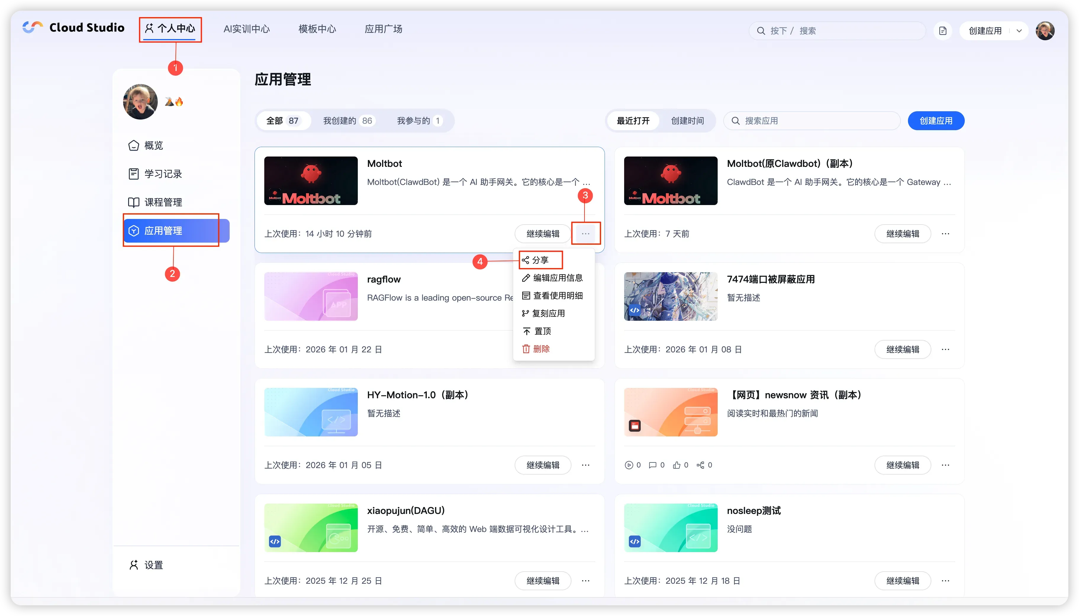 入口:个人中心 → 应用管理 → 应用卡片 「...」 → 「分享」。
