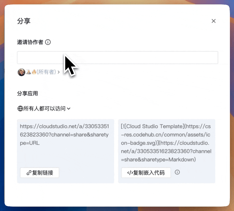 应用分享用于把应用发给他人访问,或嵌入到 README/博客等外部页面。自己的应用可配置协作与访问权限;他人的应用通常只能做基础分享与嵌入。