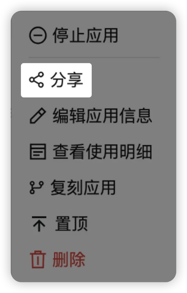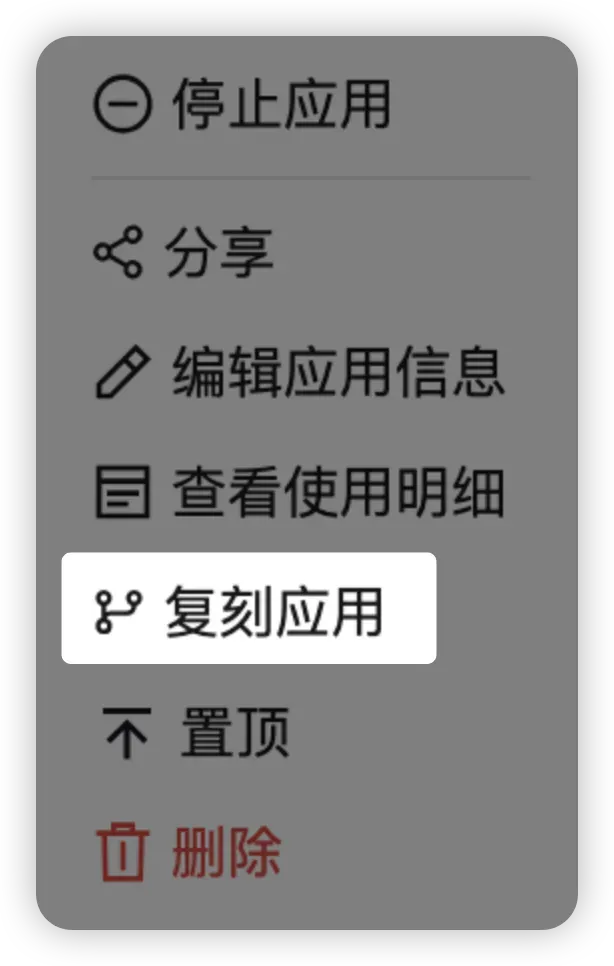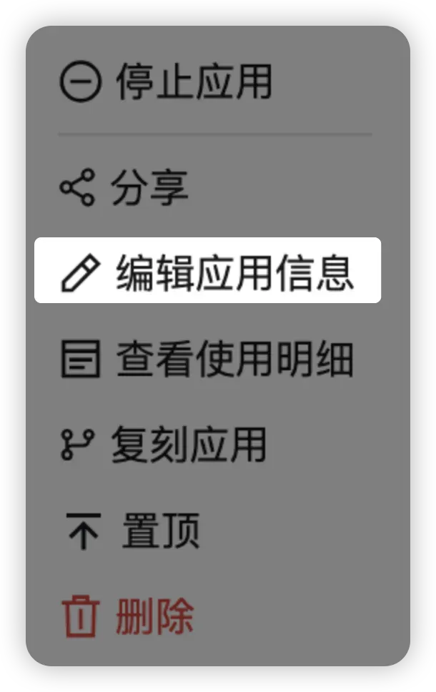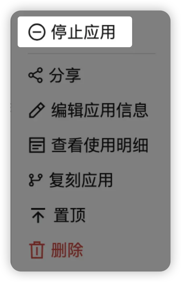 你可以在「应用管理」页集中管理自己创建的应用:停止运行、分享协作、编辑信息、查看使用明细、复刻、置顶与删除。