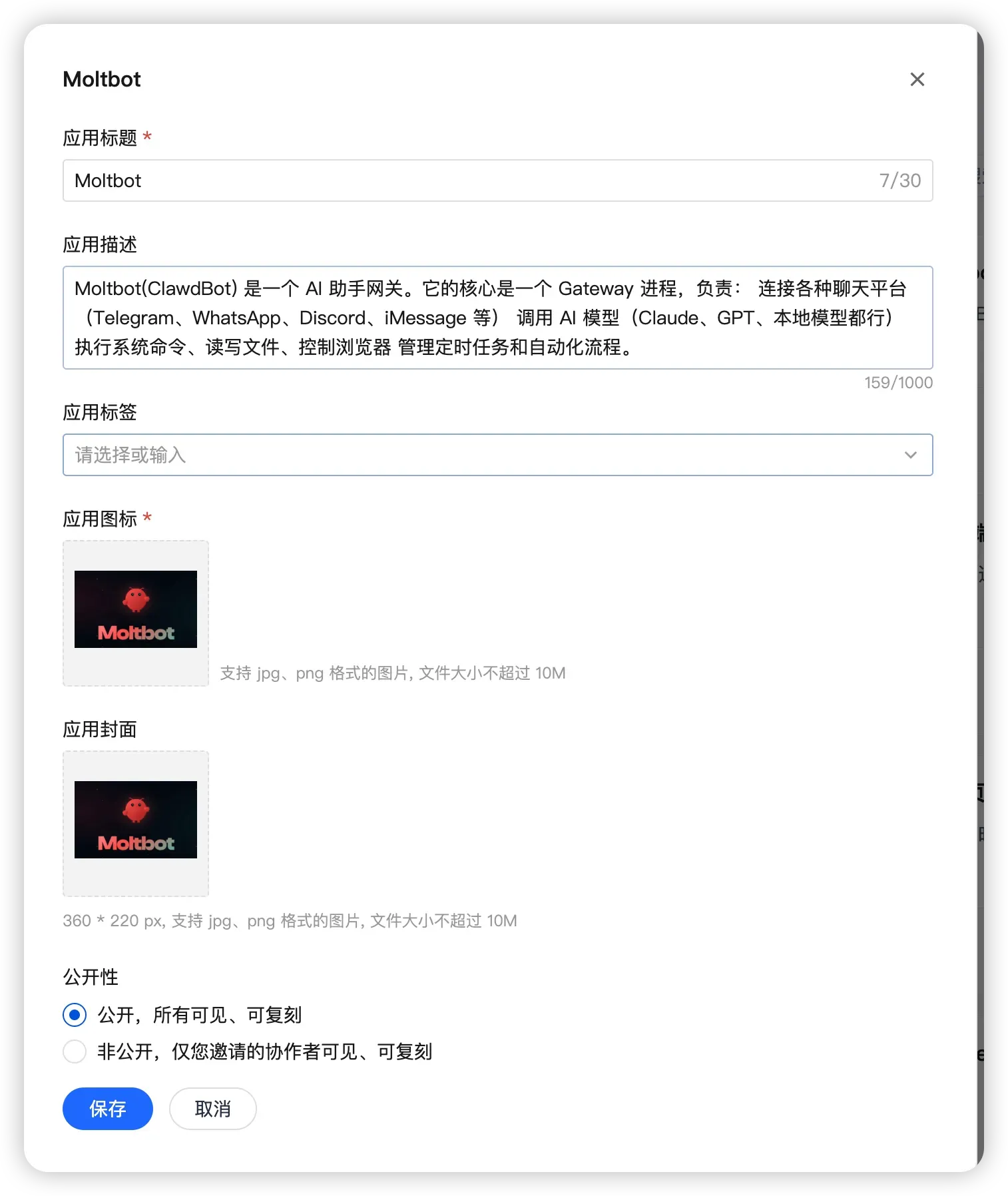 修改应用标题、描述、标签、图标、公开性等展示信息。