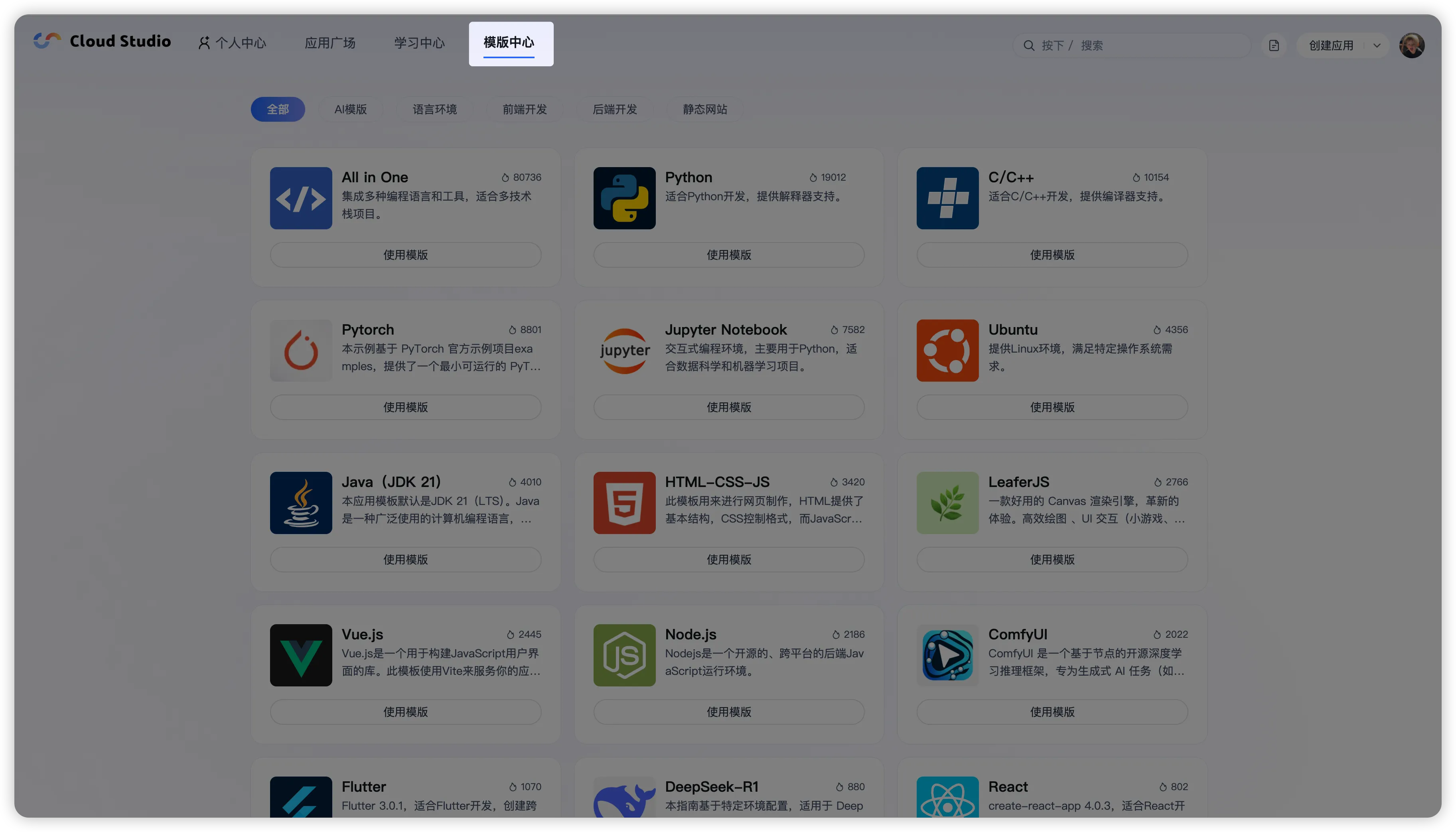 在 CloudStudio 中,通过模板可快速搭建项目环境,无需从零配置。