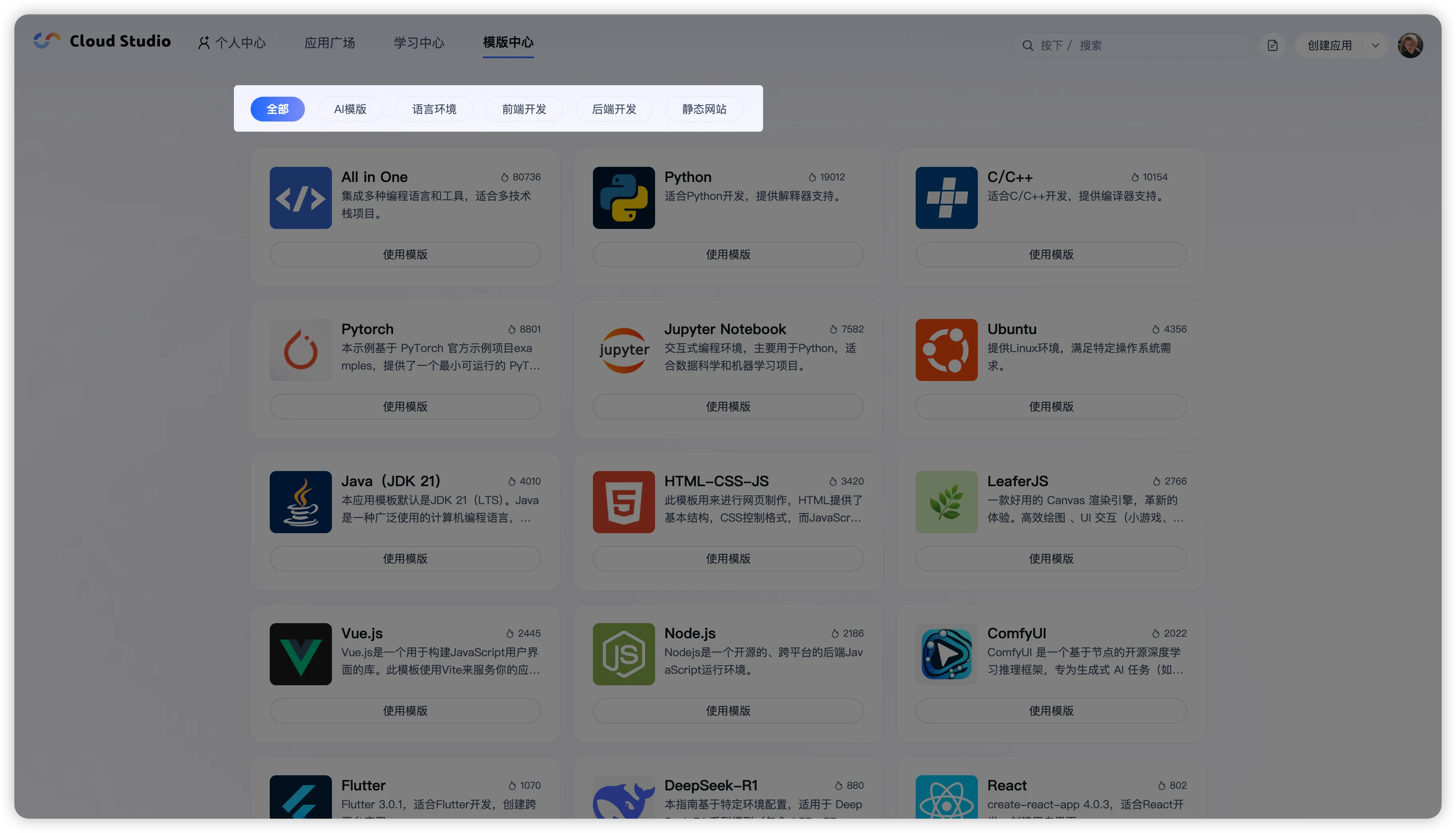 筛选模板:在模板中心页面,可按分类筛选(如 「前端」「AI」「后端」「语言环境」 )。