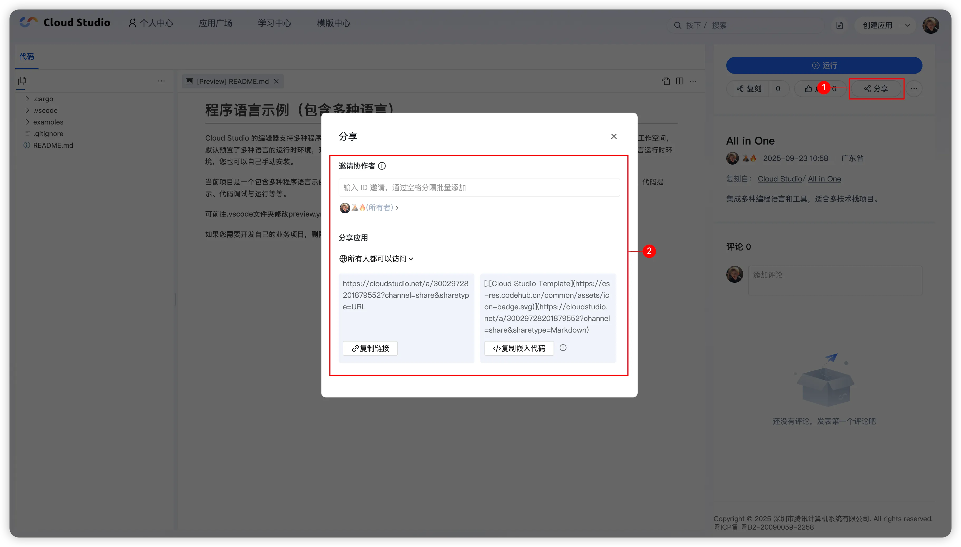 选择权限后点击 「复制链接」,将链接分享给目标用户 → 对方登录 CloudStudio 账号并打开链接,自动获得对应权限。