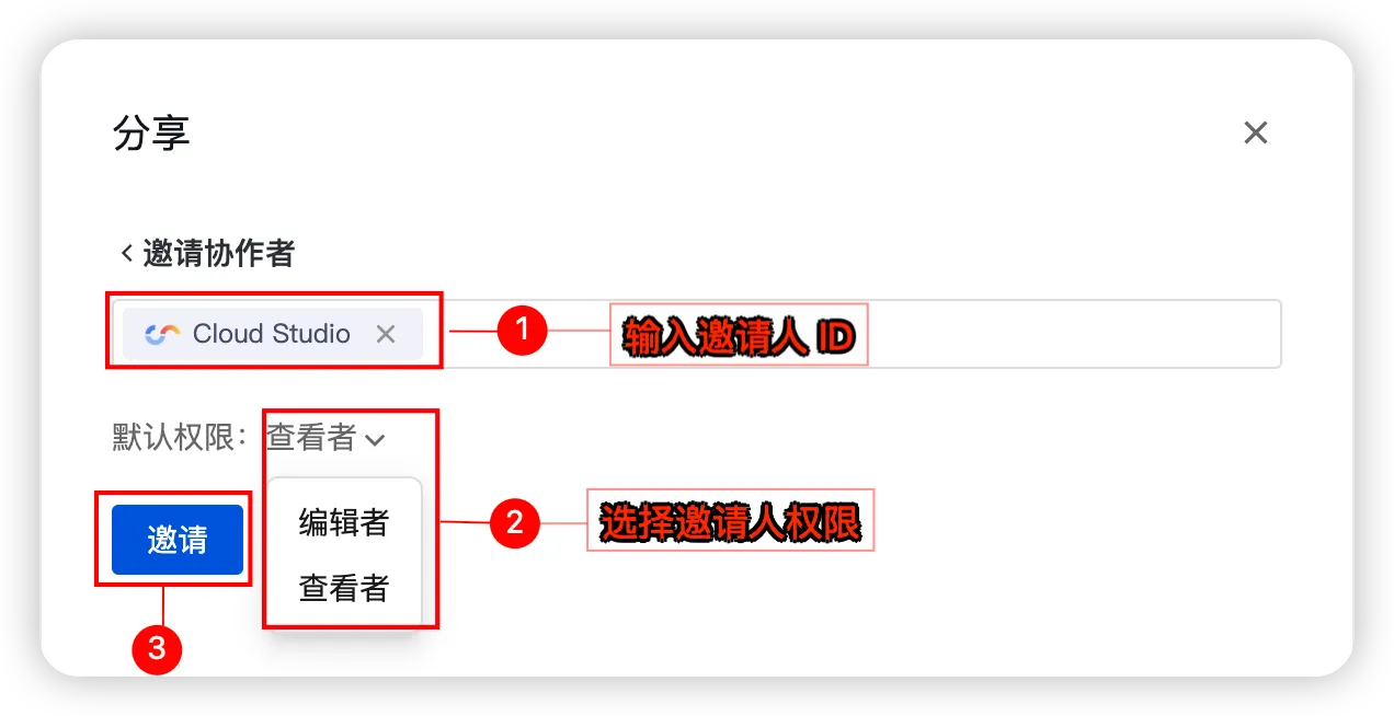 输入目标用户的 CloudStudio 用户 ID,按回车键确定 → 选择用户权限(编辑者/查看者)→ 点击邀请,完成添加。