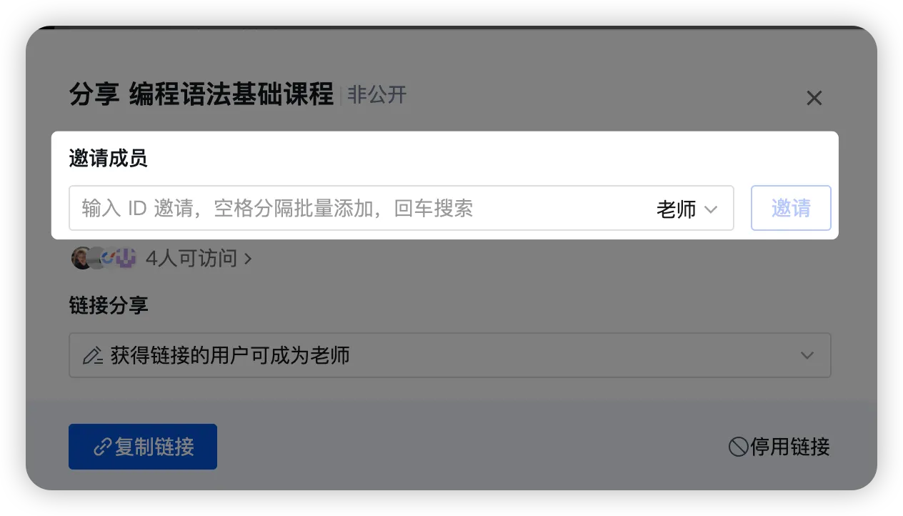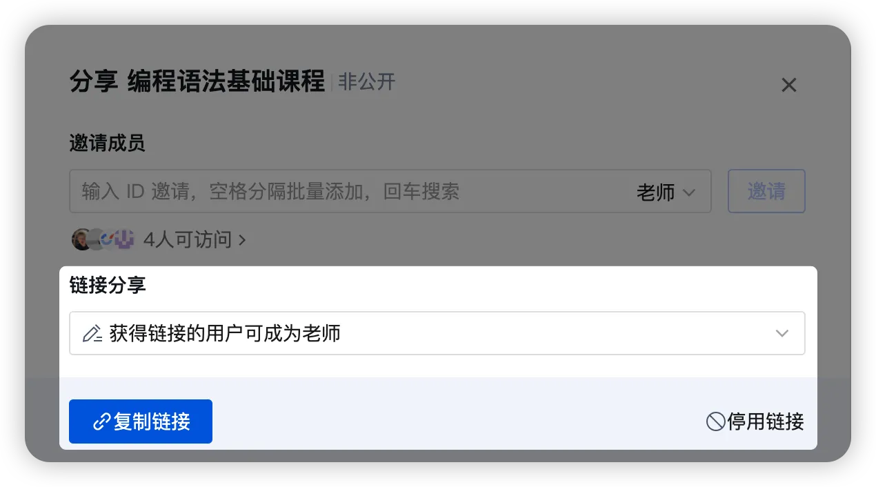 - 链接分享邀请:在 「链接分享」 区域,下拉框选择目标角色 → 点击 「创建并复制链接」,发送给被邀请人,对方点击链接即可按设定角色加入课程。