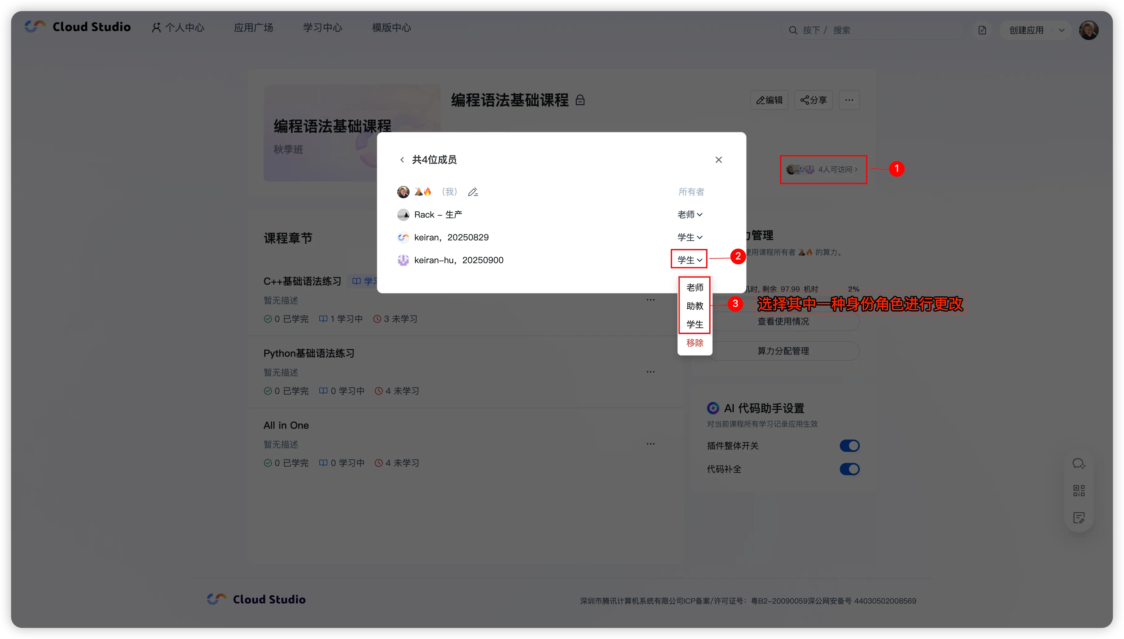 - 更改角色可能会导致成员权限发生变化,影响其对课程的操作,请在操作前确认成员的实际需求。