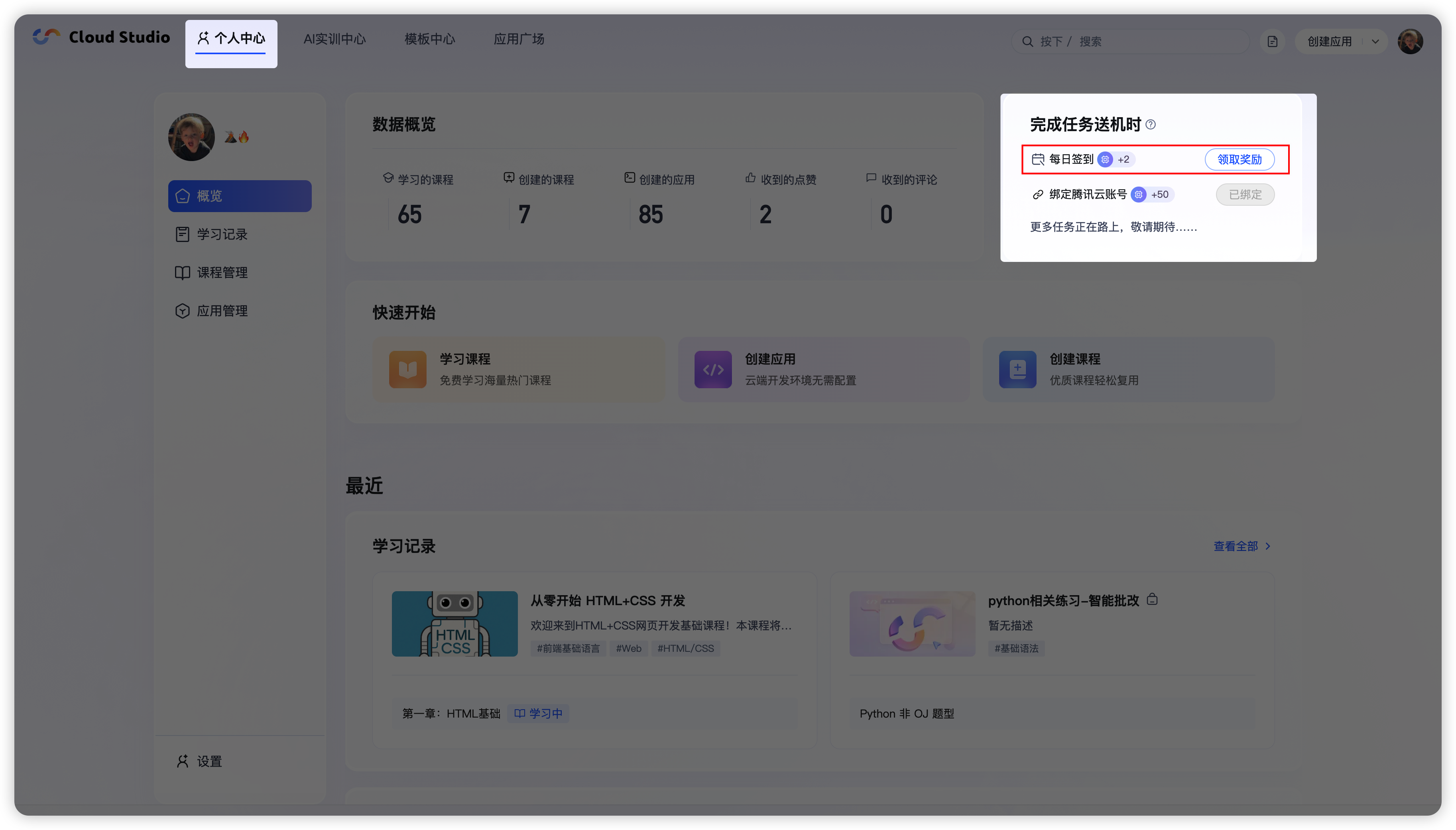 - 登录 CloudStudio 后,在上侧栏点击 「个人中心」 按钮。(快速链接点我)
