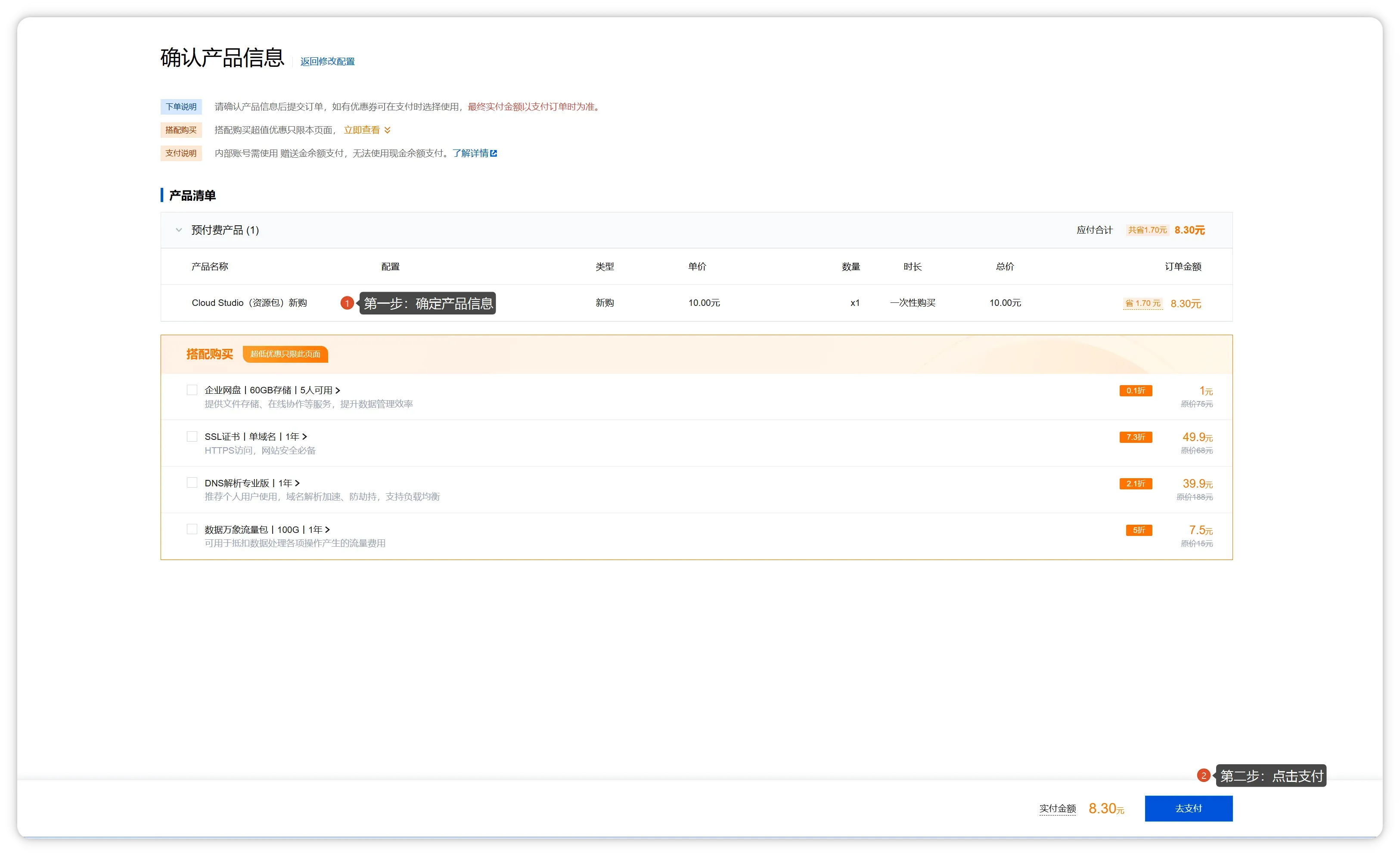 核对订单信息(数量、金额、账号),确认无误后点击【支付】,选择腾讯云支持的支付方式(如余额、微信、支付宝)完成付款。