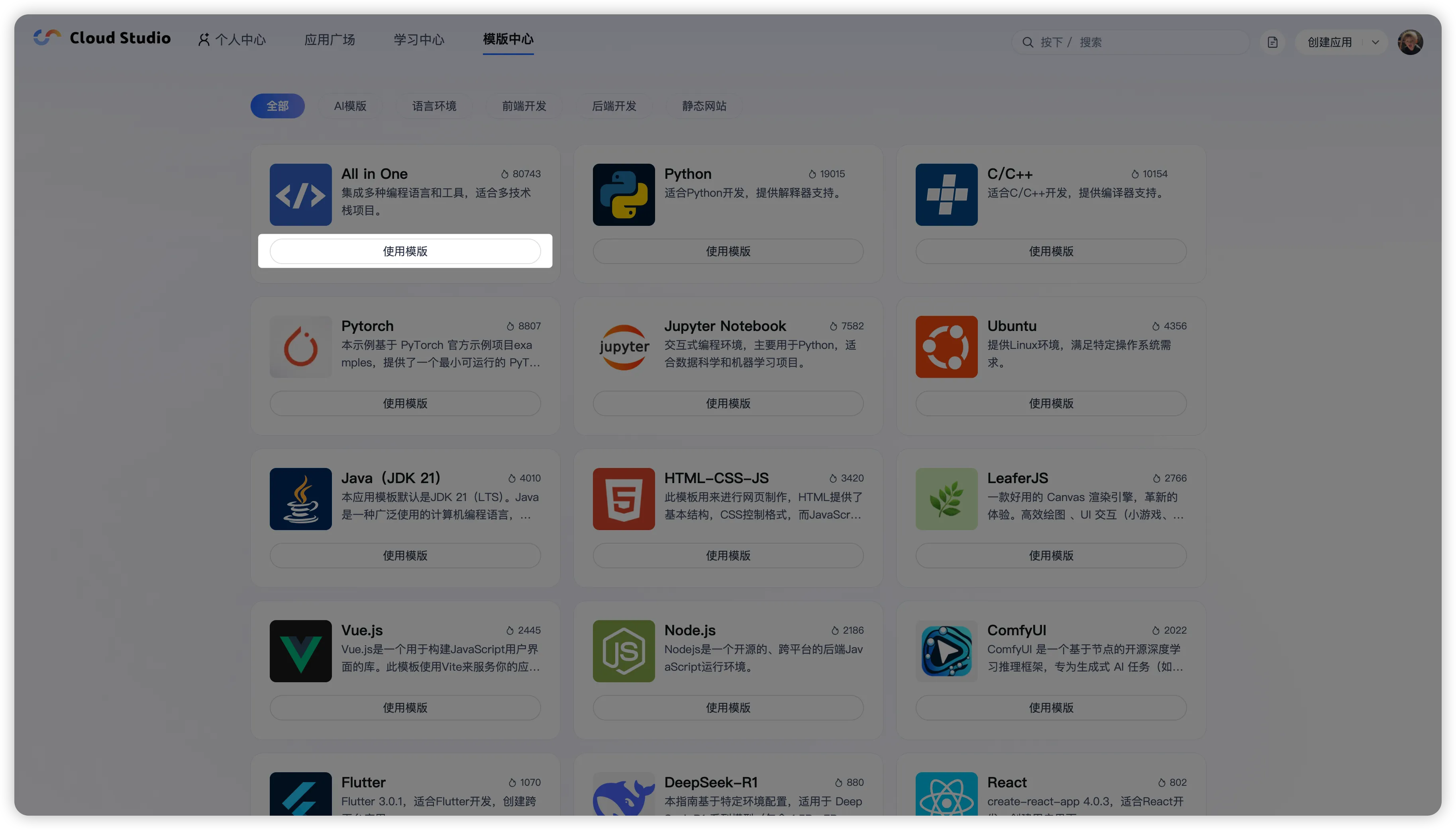 - 访问 CloudStudio 模板中心(https://cloudstudio.net/t);