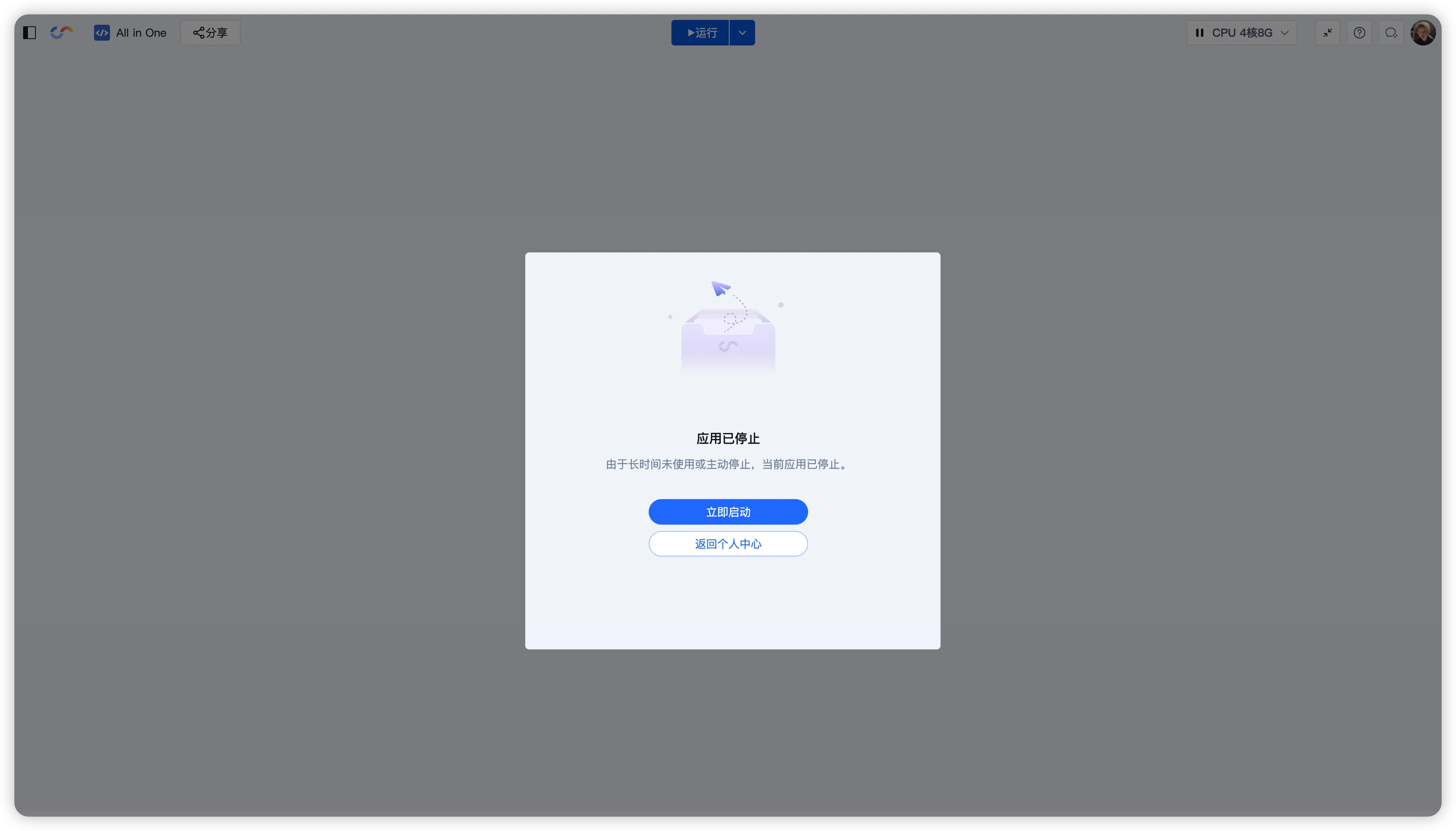注意:切换按钮右侧的 「停止」 按钮用于关闭整个算力。若工作空间无算力,将停止运行(类似手动停止应用),此时会弹出提示: