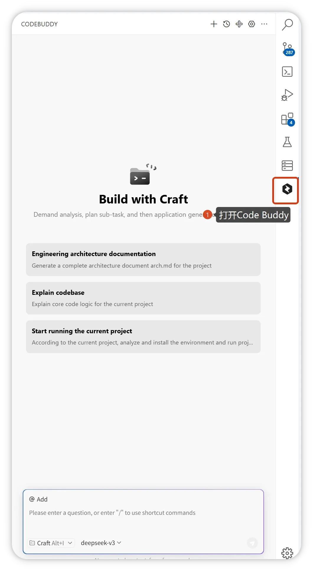 - 打开 CodeBuddy 功能面板(通过右侧工具栏唤醒);
