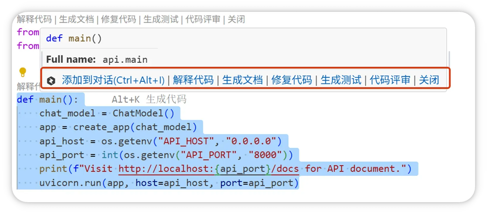 - 选中后,代码上方自动弹出功能选项栏(含“解释代码”“修复代码”“添加注释”等);
