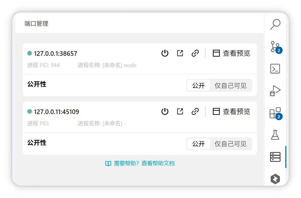 在左侧工具栏点击 「端口插件」 图标,面板会展示当前已识别的端口卡片(端口号、状态、进程信息等)。