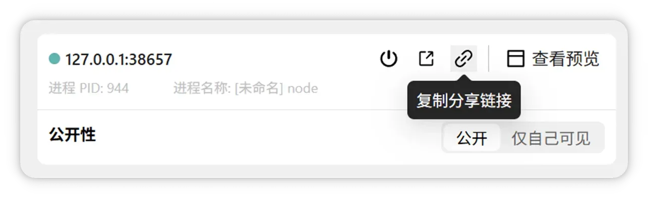 复制分享链接:点击 「复制分享链接」 按钮,快速复制端口访问链接(需确保进程已启动)。