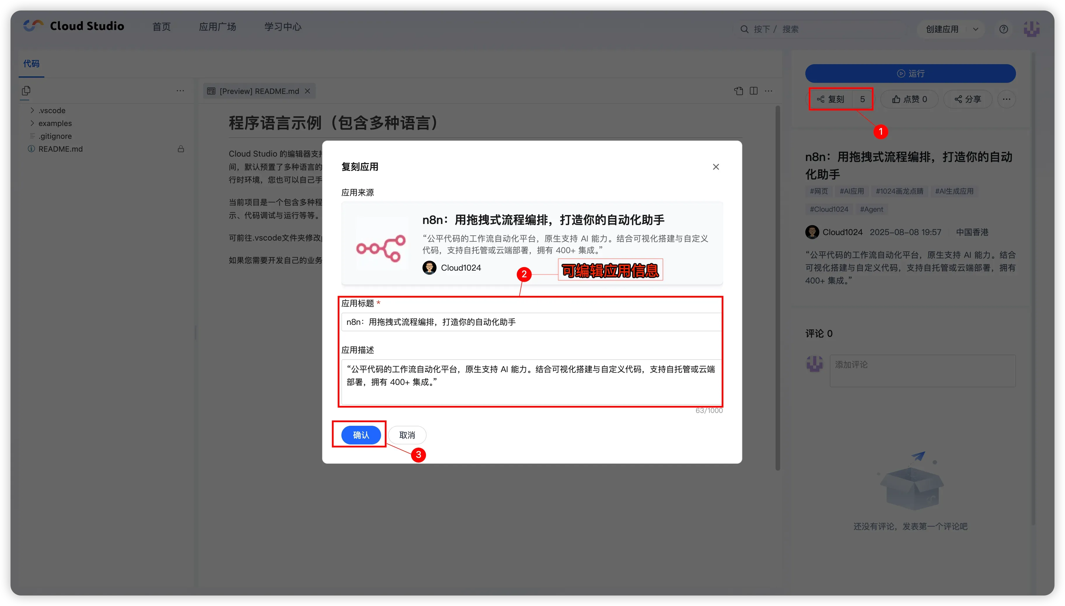 基于当前应用创建副本,是修改代码的前提操作—— 通过复刻可生成独立的应用副本,你可基于此副本进行二次开发、个性化调整或备份。复刻时,支持修改 「应用标题」 和 「应用描述」。