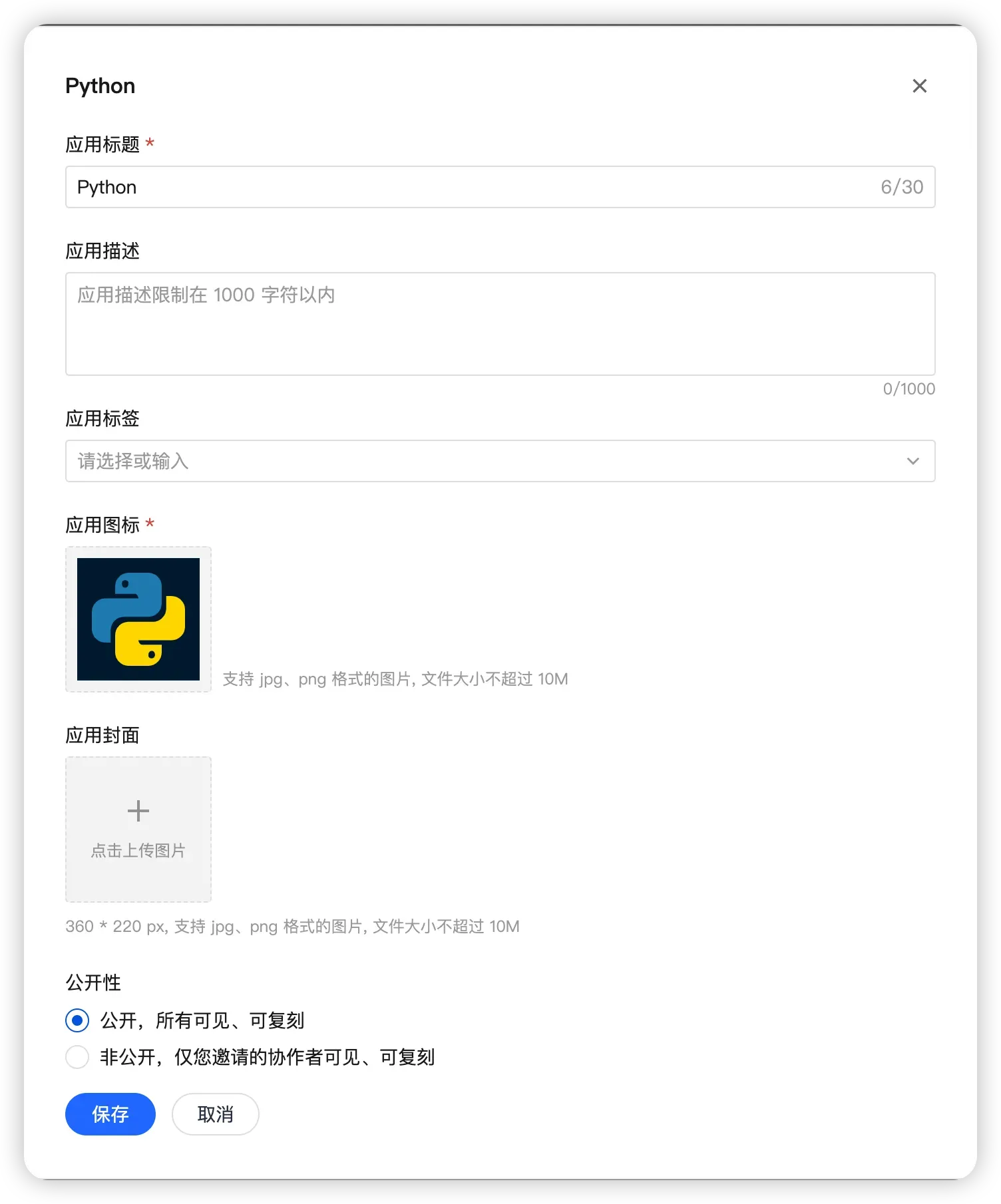 可修改应用的标题、描述、封面以及公开性等基础信息,以此完善应用的展示内容。