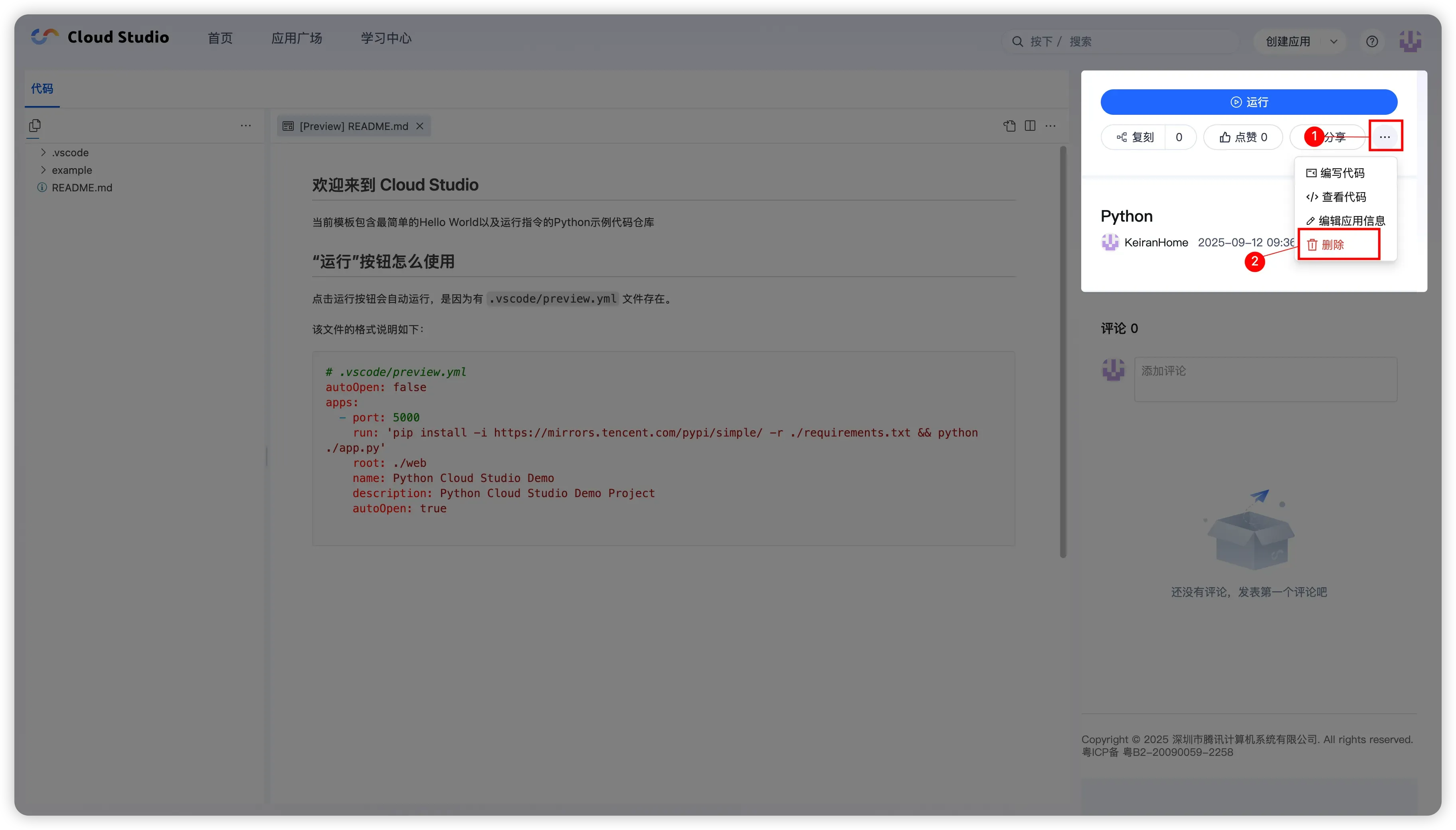 直接启动应用,主要用于预览应用的实际运行效果,无法对应用代码进行修改。若需调整应用功能,需通过后续的 「复刻」 功能操作。