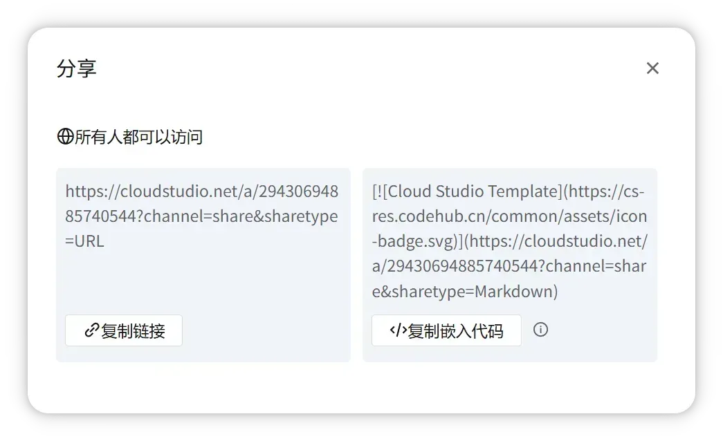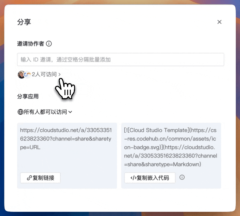应用分享用于把应用发给他人访问,或嵌入到 README/博客等外部页面。自己的应用可配置协作与访问权限;他人的应用通常只能做基础分享与嵌入。