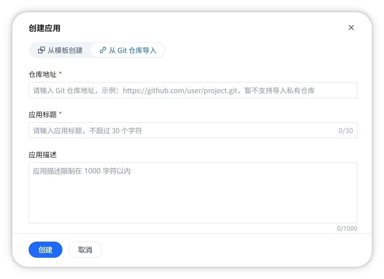 | 从 Git 仓库导入 | 已有项目迁入、继续开发 | 仓库地址(CNB/GitHub/Gitee/GitLab 等) |