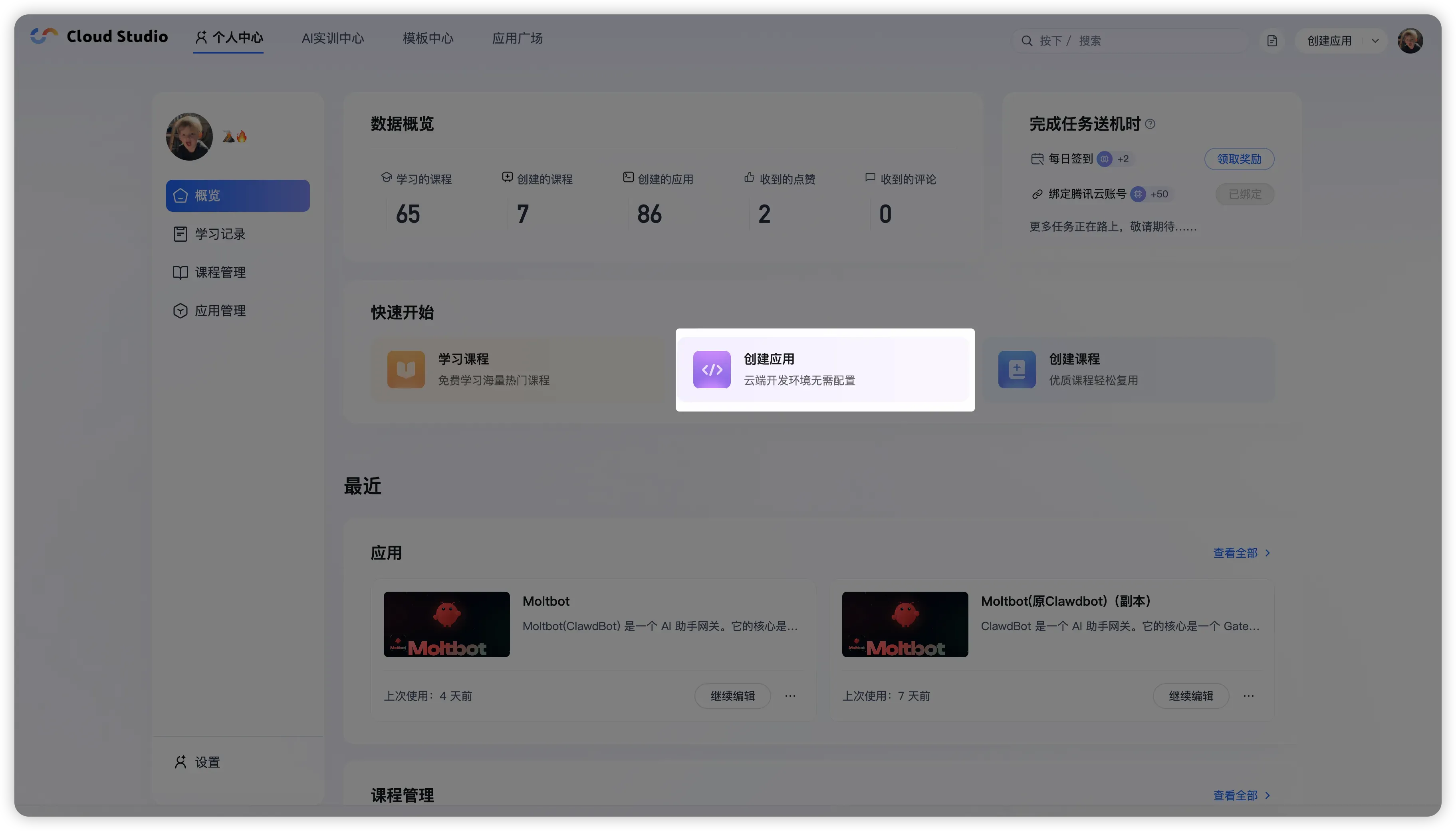 - 进入创建页(右上角「创建应用」或个人中心入口)