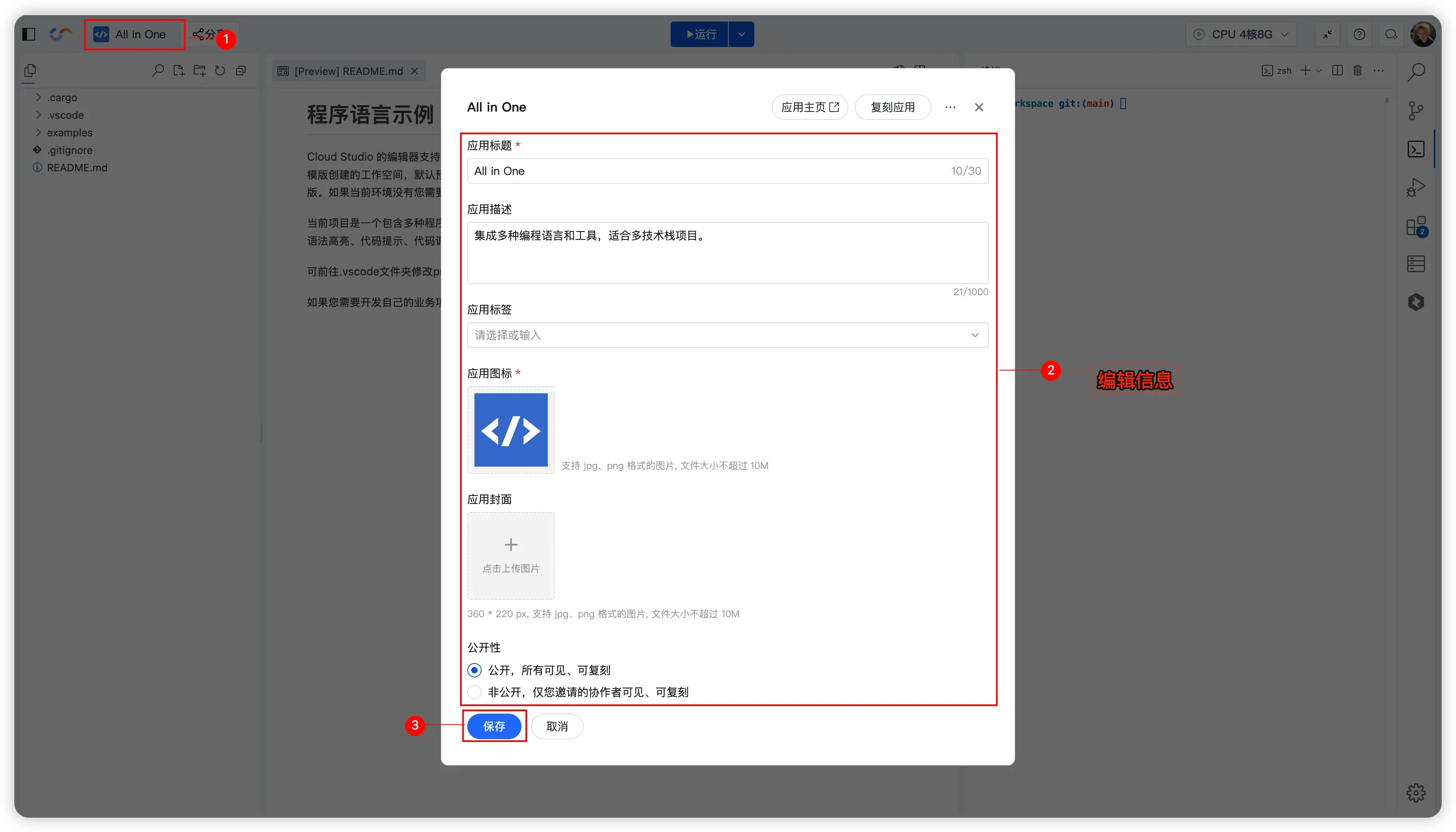 创建成功后会自动进入工作空间。点击左上角的应用名称,在弹窗中补全信息: