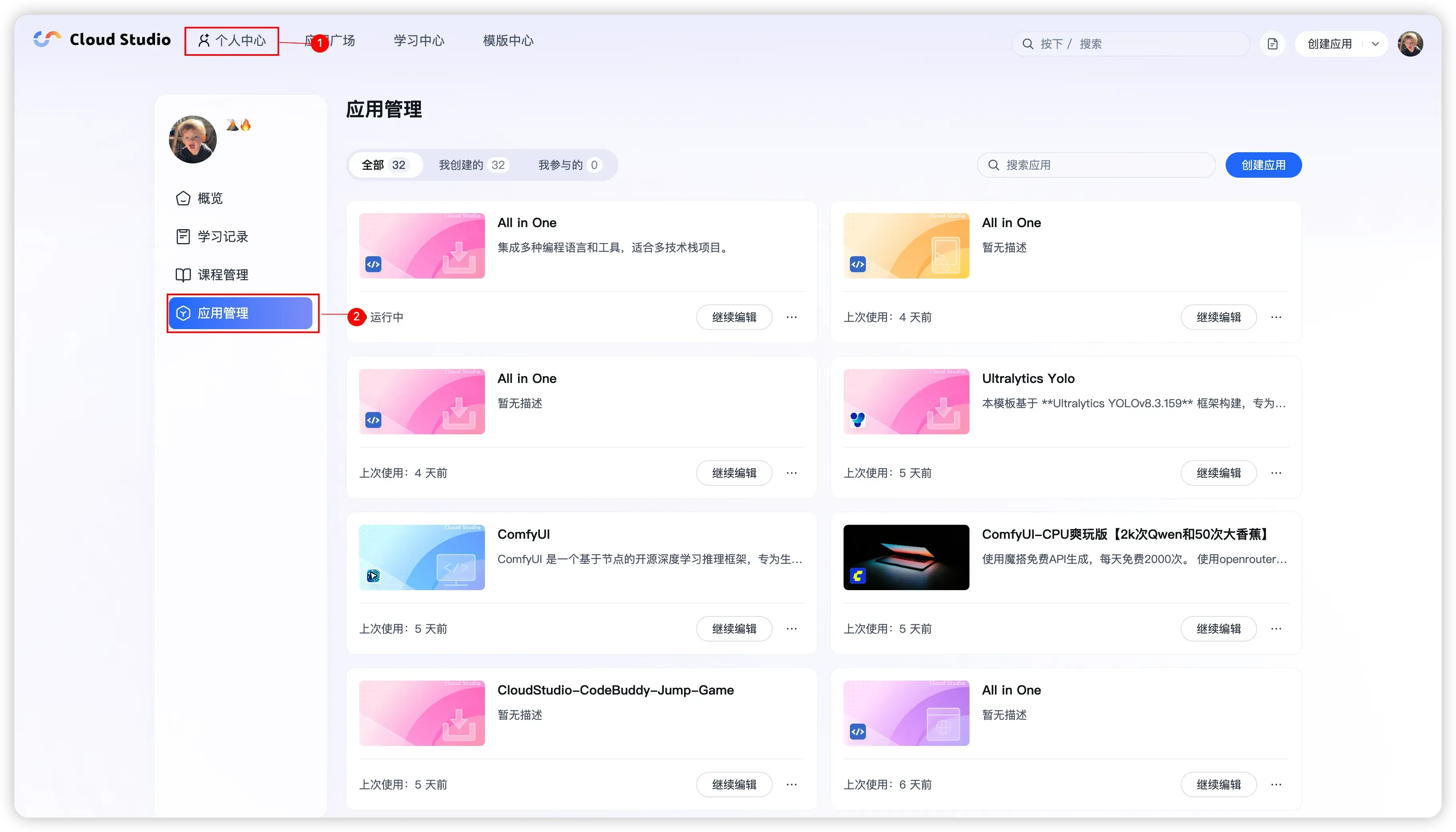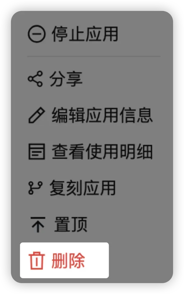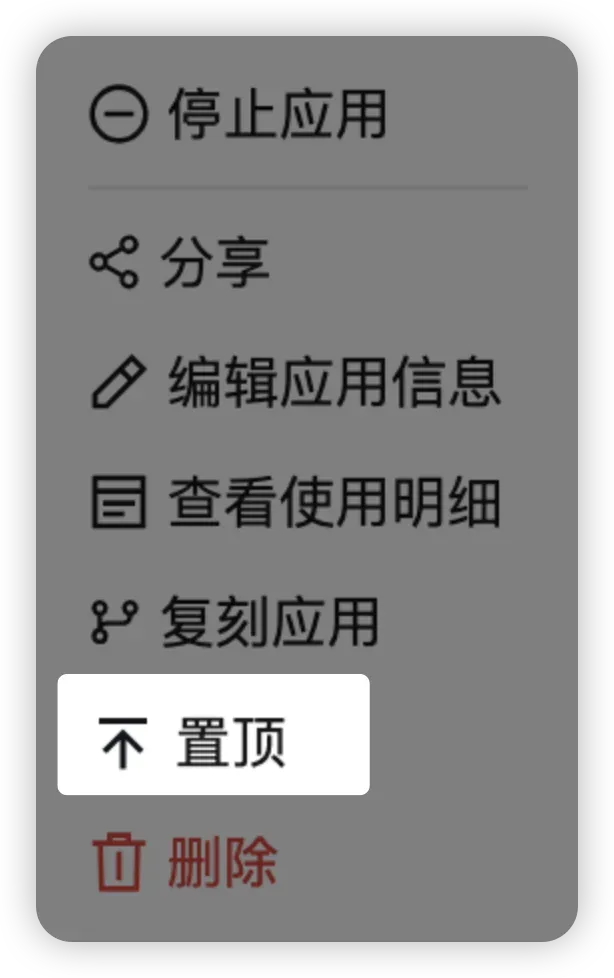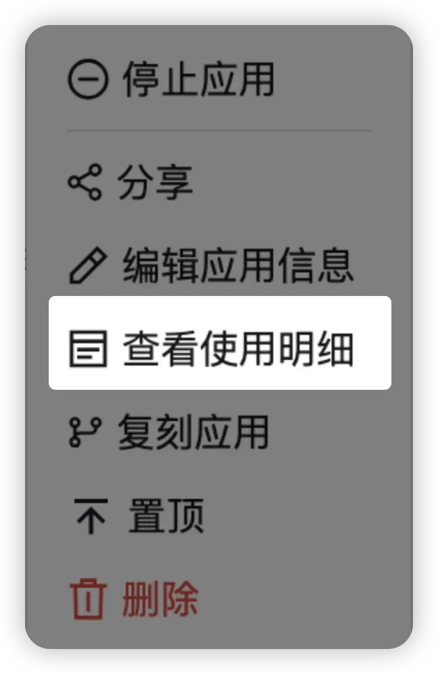 你可以在「应用管理」页集中管理自己创建的应用:停止运行、分享协作、编辑信息、查看使用明细、复刻、置顶与删除。