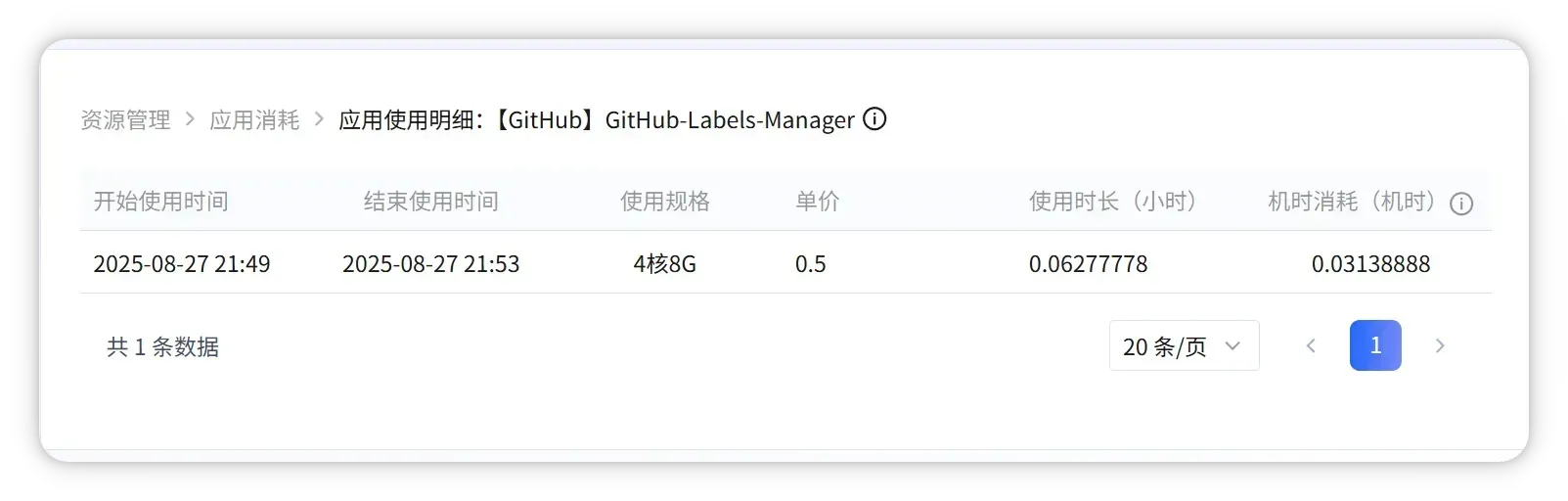 查看机时使用详情(开机起止时间、规格、时长、消耗等)。