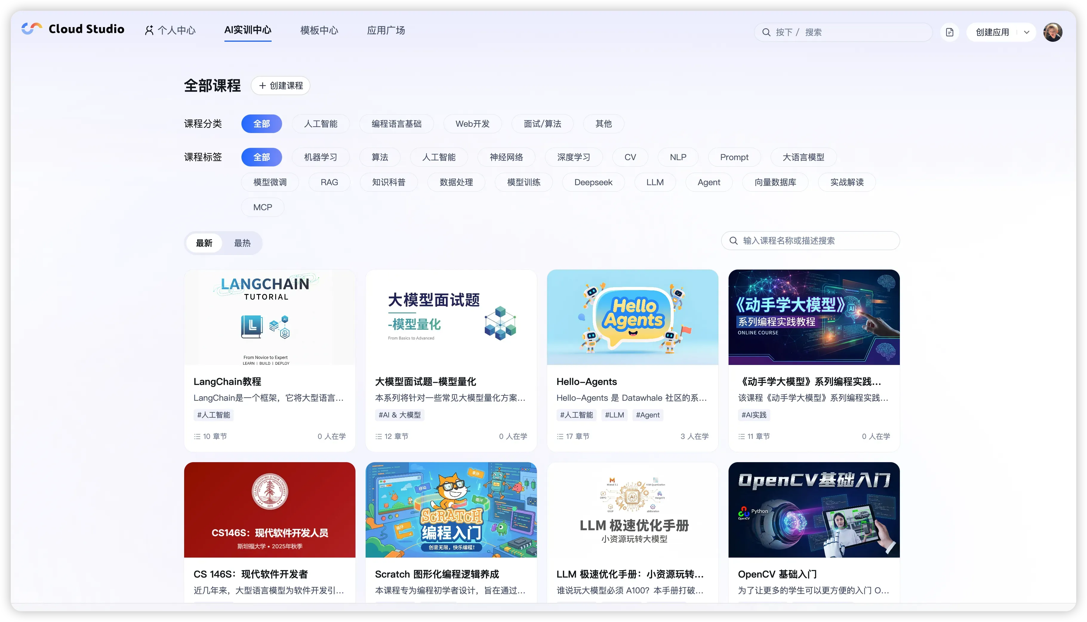 AI 实训中心是 CloudStudio 的学习专区,提供「边学边练」的课程:先用短小的知识点入门,再在云端环境里完成练习/项目。