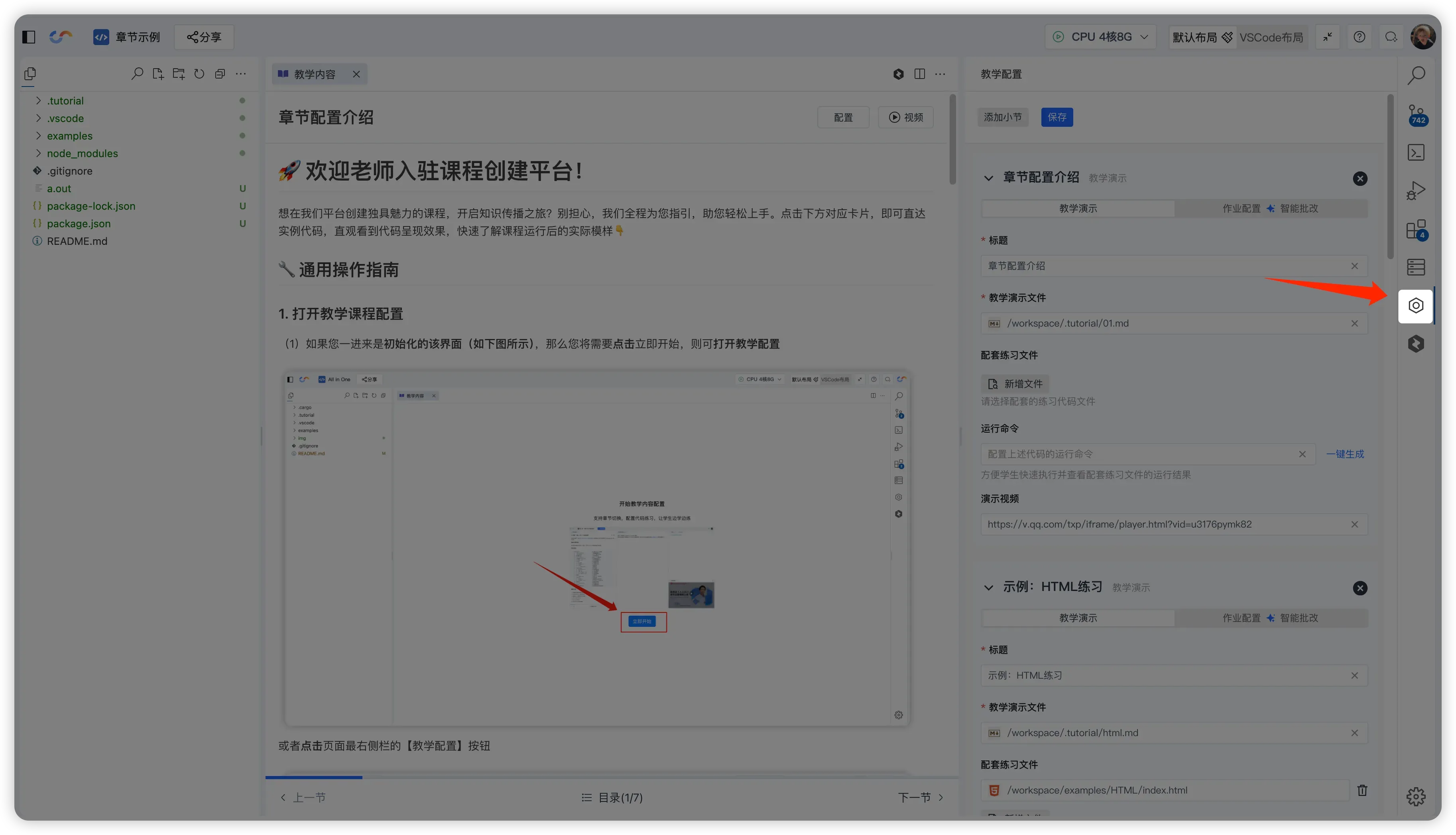 - 配置教学:进入章节 → 教学内容配置 → 点 「添加小节」 → 选教案/练习文件 → 配运行命令/视频 → 保存