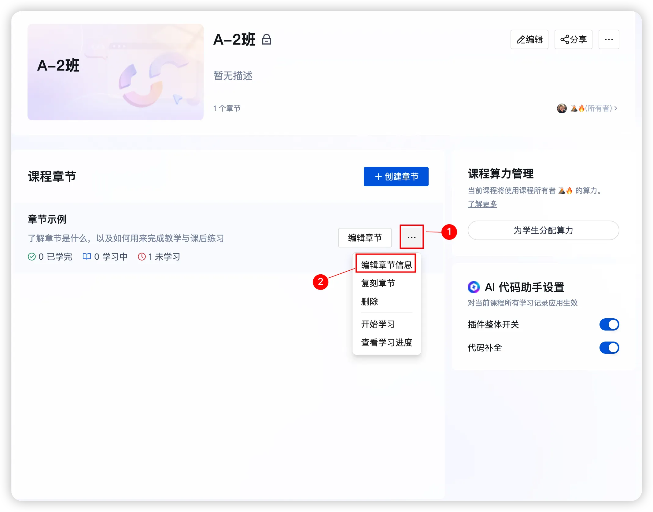 在课程展示页面,找到需要编辑的章节,在其 最右侧 点击 「...」(更多操作按钮),在展开的菜单中选择 **「编辑章节信息」**,即可进入编辑弹窗。