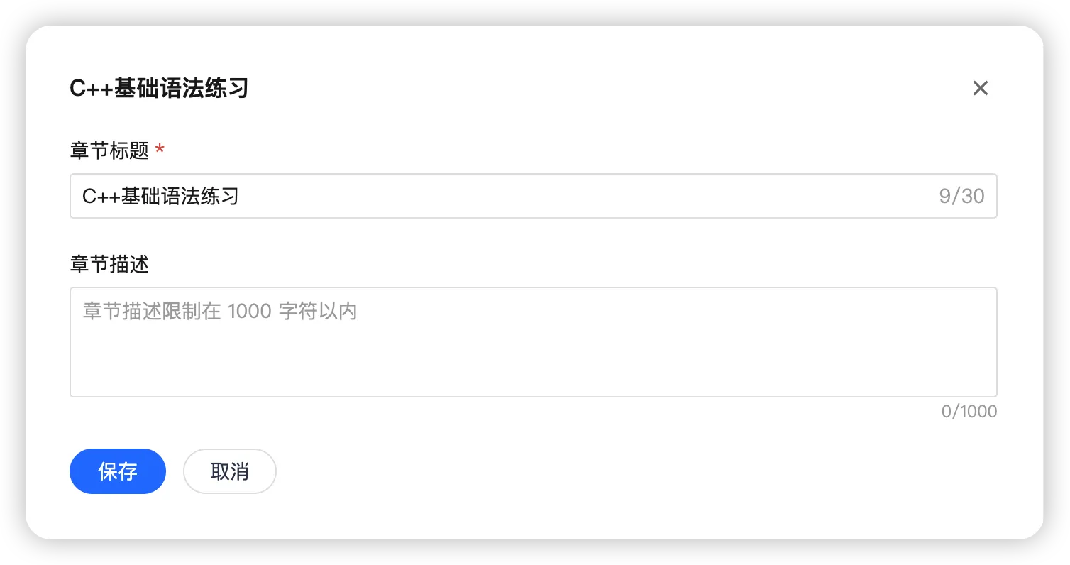 https://github.com/xxx/xxx.git)、章节标题(自定义该章节的名称,便于识别)。 - 选填项:描述(简要说明章节内容,如 "Python 基础语法代码示例" )。