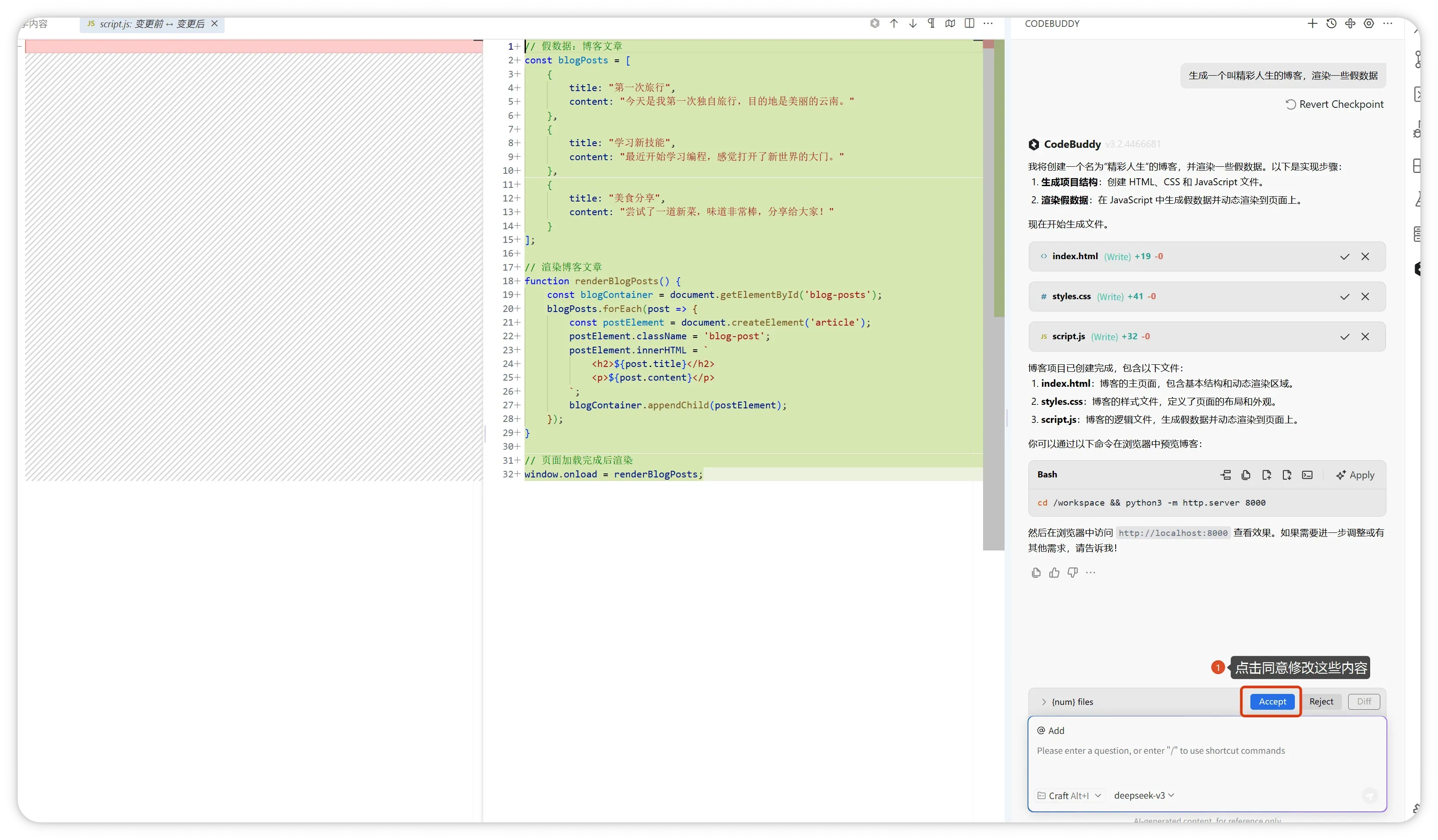 CloudStudio 内置腾讯云代码助手 CodeBuddy(支持混元/DeepSeek 多模型切换),提供代码注释、逻辑解释、错误修复、单元测试、变量命名等智能辅助功能,并新增 Code Craft 开发智能体能力——通过自然语言指令即可实现多文件生成与改写,显著降低开发门槛,提升编码效率数倍。